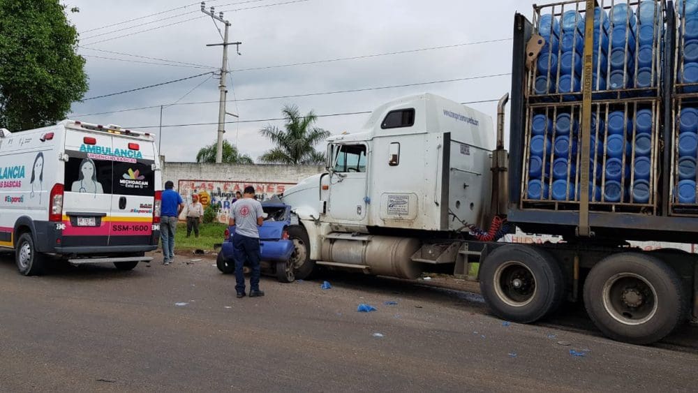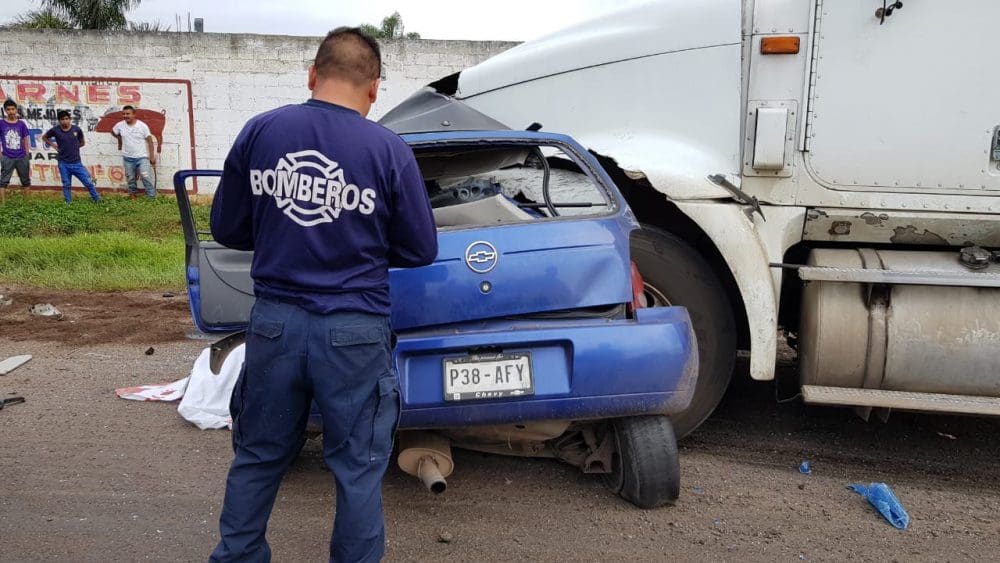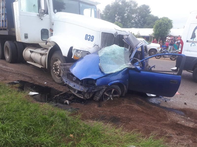El accidente se produjo entre un tráiler de la empresa Santorini que transportaban agua en garrafón contra un auto compacto de la marca Chevrolet, tipo Chevy color azul, con placas P38 — AFY.