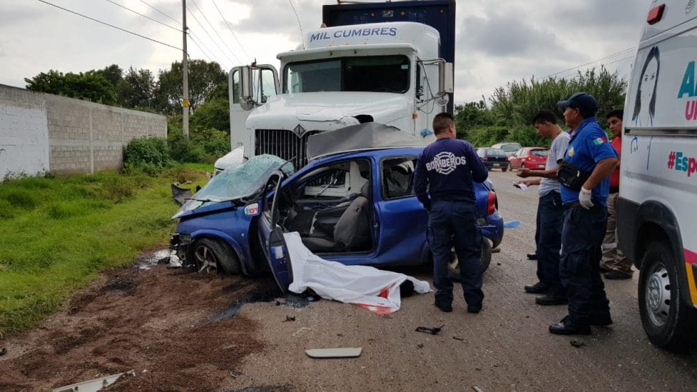 El accidente se produjo entre un tráiler de la empresa Santorini que transportaban agua en garrafón contra un auto compacto de la marca Chevrolet, tipo Chevy color azul, con placas P38 — AFY.