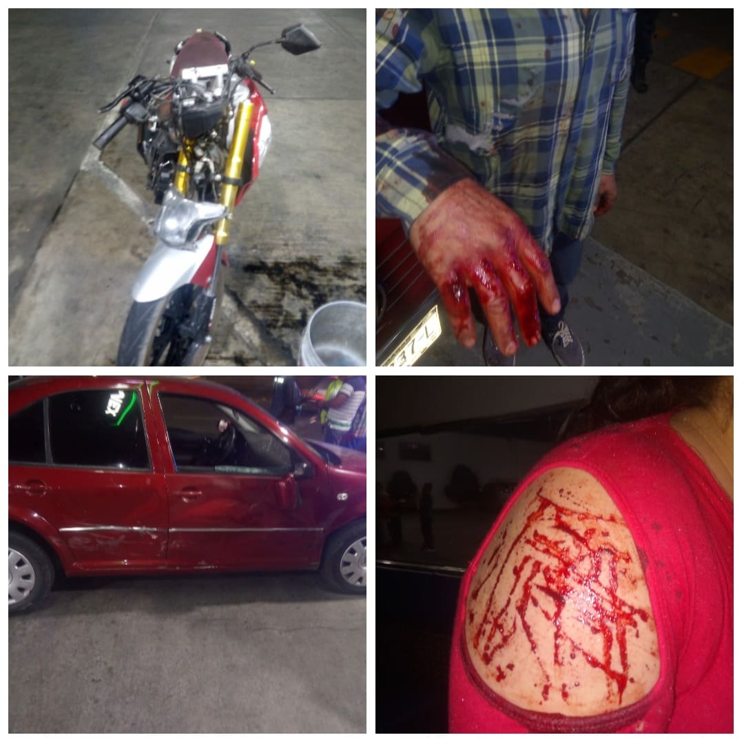 Zitácuaro. Mich. El Cuerpo de Bomberos y Protección Civil, informó que recibió una llamada de C5, manifestando que en Avenida Revolución y Leandro Valle, como referencia a un costado de la gasolinera del seguro, se había suscitado un percance vehicular, al llegar al lugar se confirma la novedad tratándose de un choque, entre una motocicleta y un vehículo.