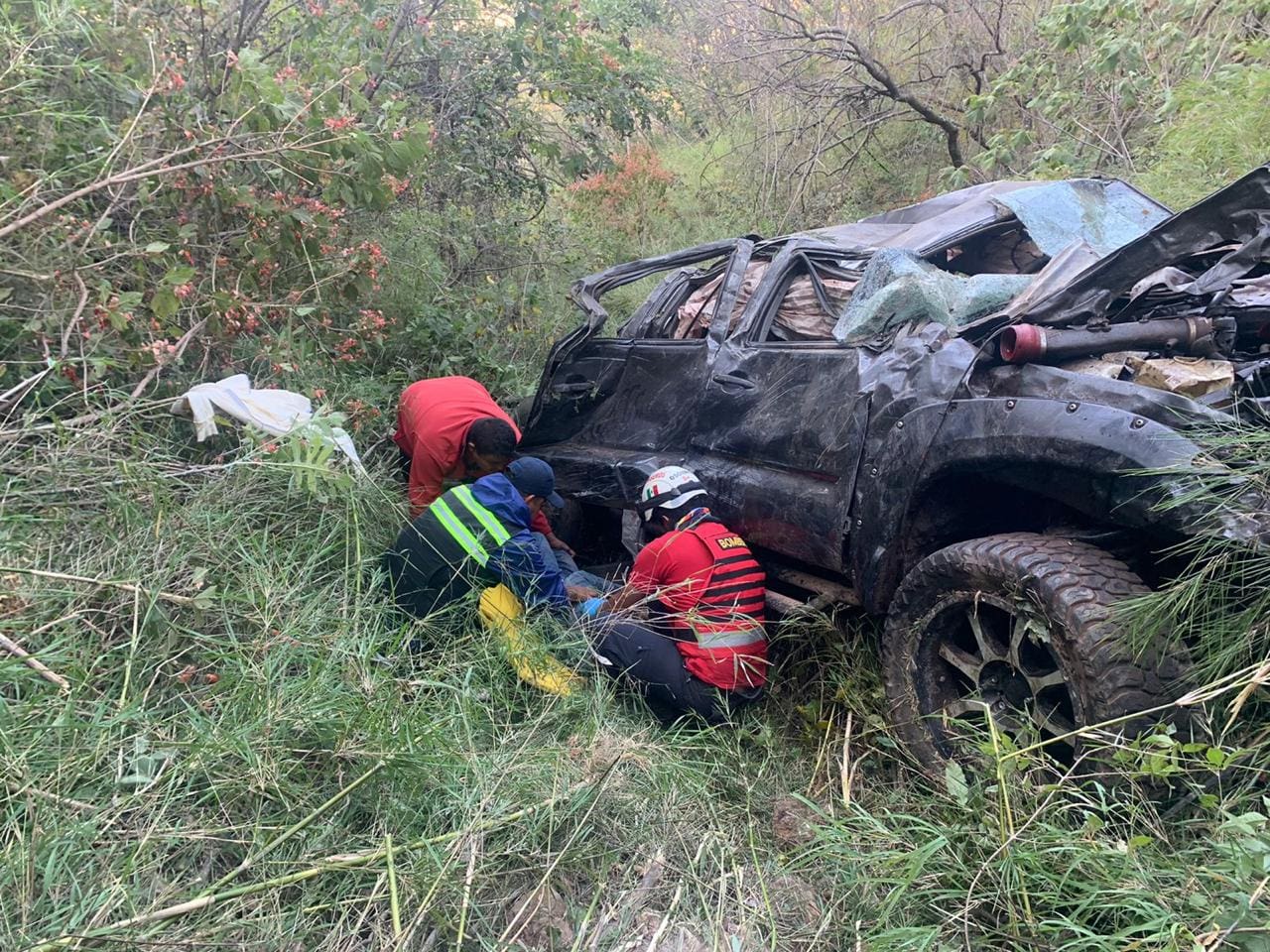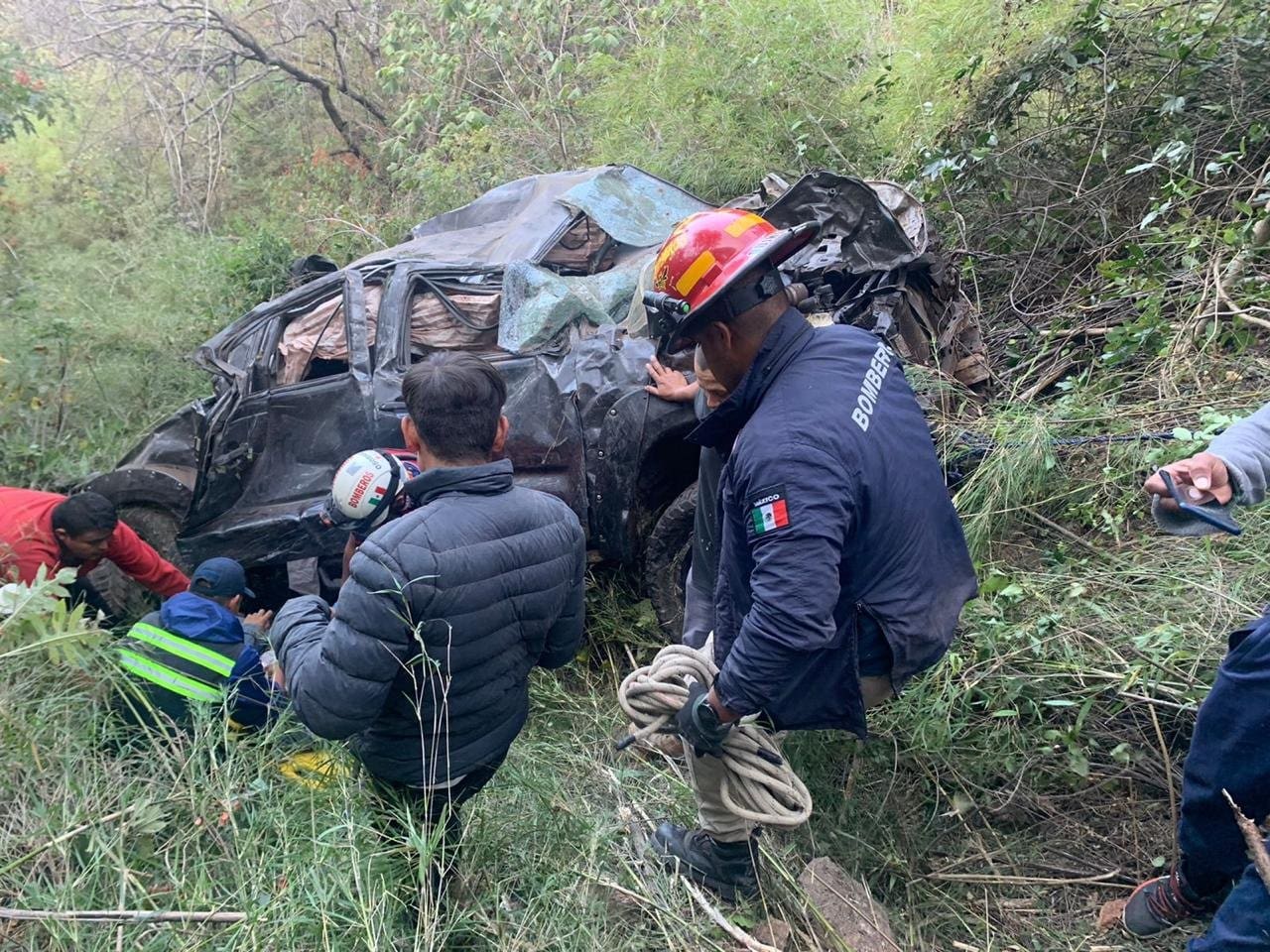 Elementos de bomberos realizaron maniobras de rapel para poder llegar al vehículo Toyota tipo Tacoma, donde se encontraba el conductor prensado, por lo que se iniciaron trabajos para la extracción y liberación del cuerpo.