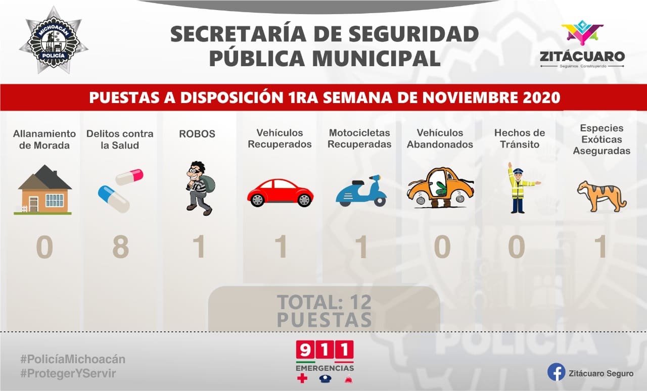 ZITÁCUARO, Mich., 10 de noviembre de 2020.- Con el objetivo de Proteger y Servir a los ciudadanos, al Secretaría de Seguridad Pública Municipal SSPM a cargo del Comisario Toribio Sánchez Martínez; fueron presentadas ante el Agente del Ministerio Público de la Fiscalía General del Estado, 12 puestas a disposición correspondientes a la primera semana del mes de noviembre del presente año.