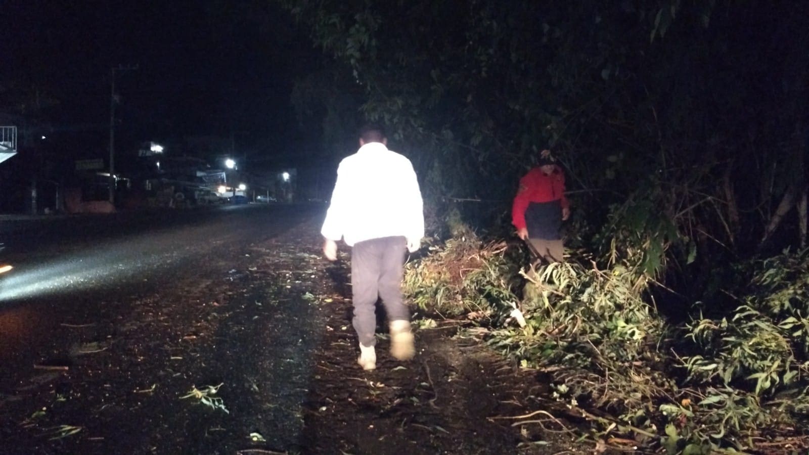 Bomberos de Zitácuaro retiran ramas de árboles caídas en la carretera federal Zitácuaro-Morelia.