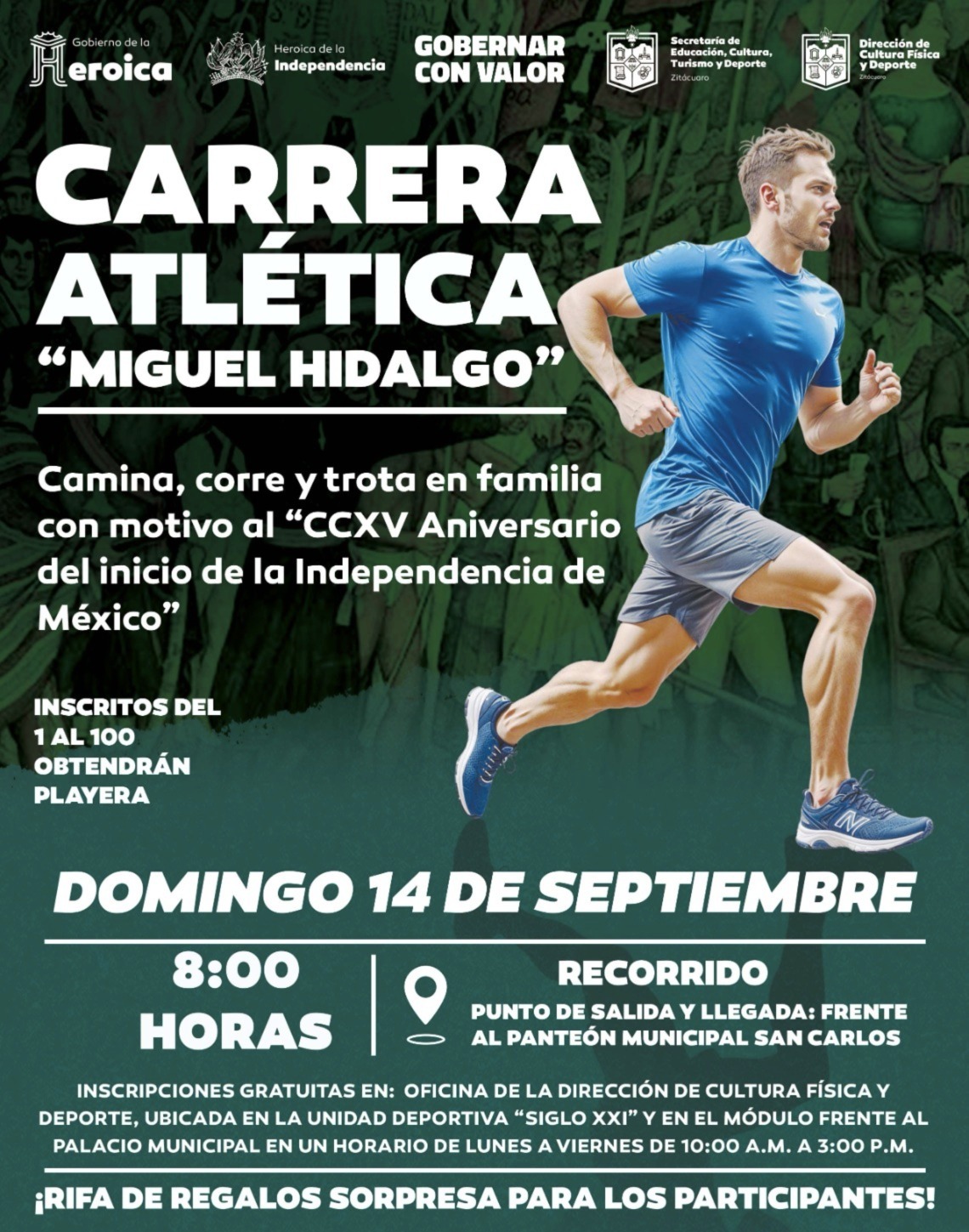 La Heroica, 12 de septiembre de 2025 – El Gobierno de la Heroica invita a la ciudadanía a participar en la Carrera Atlética “Miguel Hidalgo”, un evento deportivo y familiar que conmemorará el 215 aniversario del inicio de la Independencia de México. La actividad se realizará el domingo 14 de septiembre a las 8:00 a.m., con salida y llegada en el Panteón Municipal San Carlos.