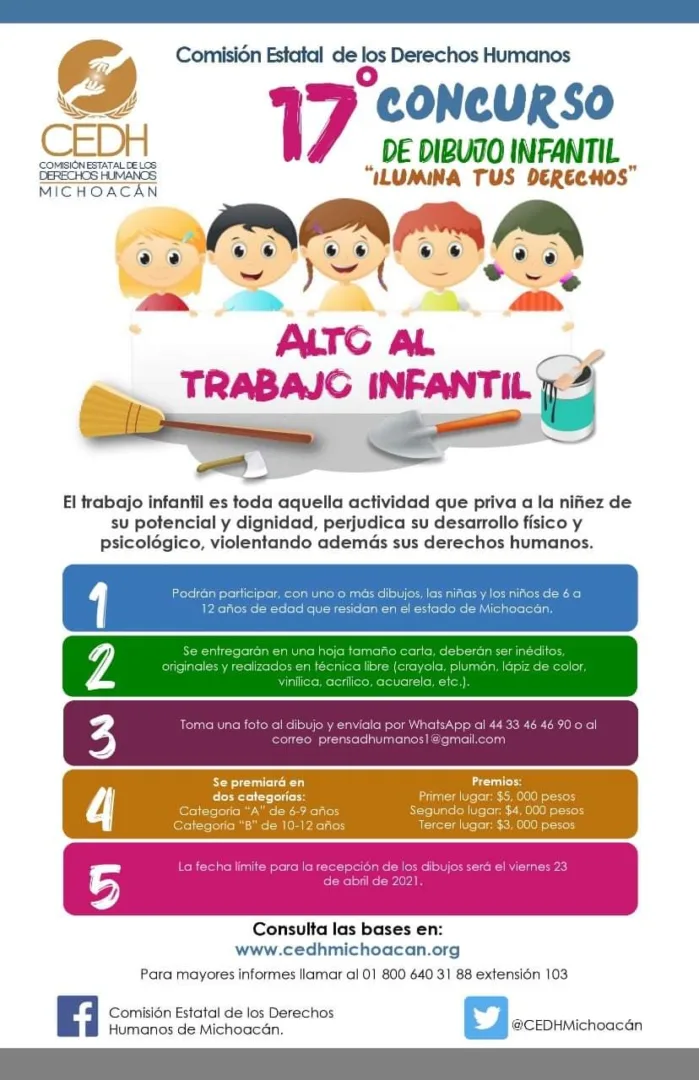 Zitácuaro. Mich. La Comisión Estatal de Derechos Humanos (CEDH), a emitido la convocatoria para el 17º Concurso de Dibujo Infantil “Ilumina tus Derechos”, este año bajo el tema “Alto al Trabajo Infantil”, por lo que se pide a todos los niños y niñas que deseen participar en este concurso, elaboren su dibujo enfocado al tema ya mencionado, para que se puedan ganar alguno de los premios que se estarán otorgando a los primeros tres lugares.