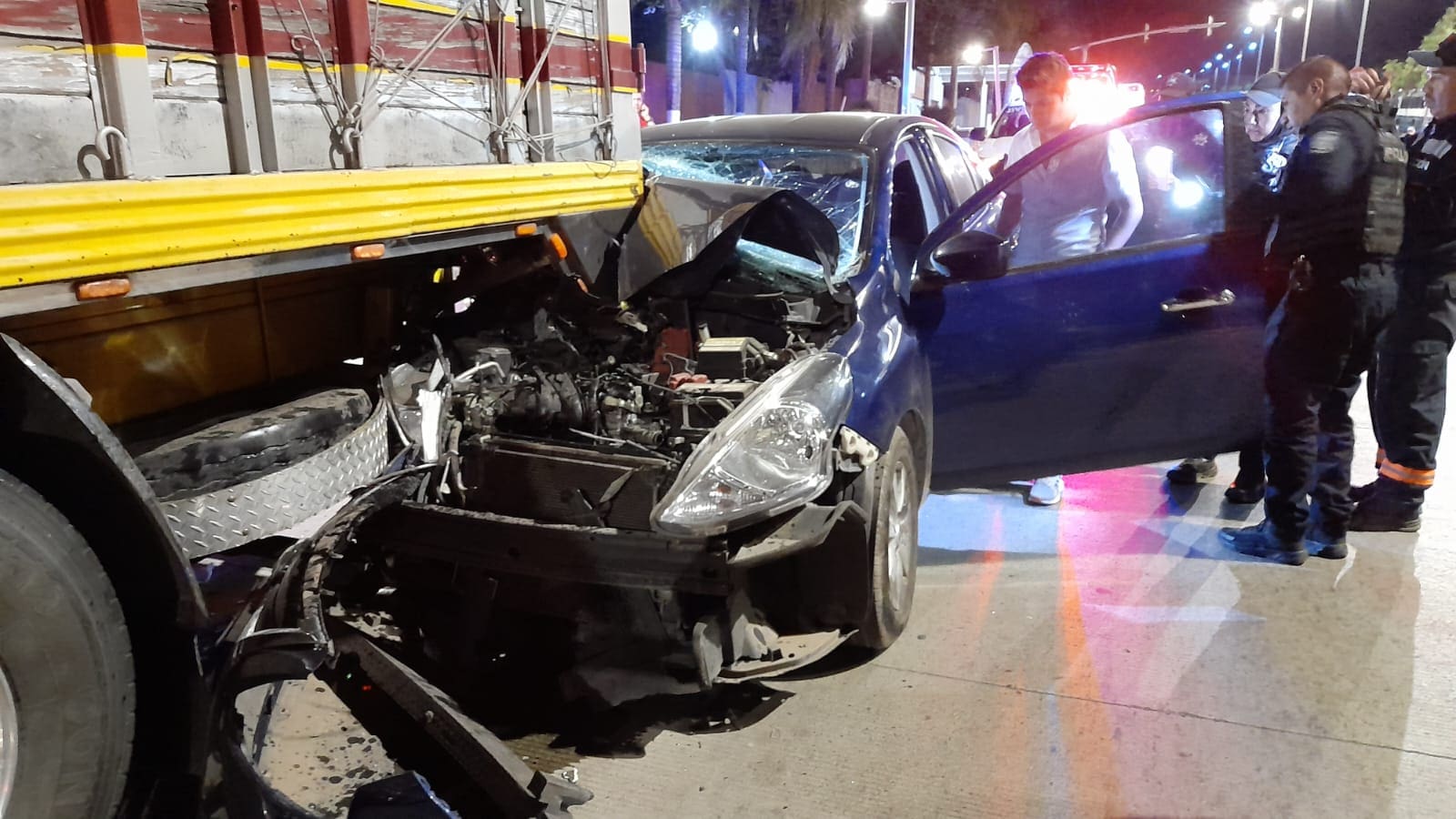Zitácuaro, Michoacán.- La noche de este sábado se registró un accidente vehicular en la avenida Revolución Sur, frente a la secundaria técnica número 49 Samuel Ramos, donde un automóvil Nissan Versa de color azul se impactó contra un tractocamión Dina de color amarillo.