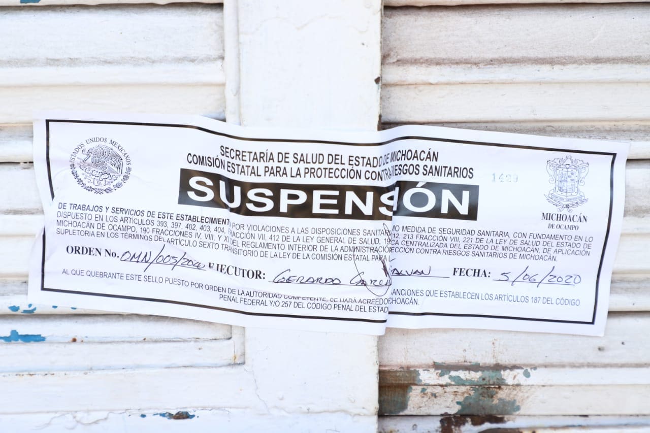 Lázaro Cárdenas, Michoacán, a 5 de junio de 2020.- La Secretaría de Salud de Michoacán (SSM), a través de la Comisión Estatal para la Prevención Contra Riesgos Sanitarios (Coespris), clausuró cinco establecimientos por no cumplir las medidas implementadas por el Gobierno del Estado para proteger a la población de COVID-19.