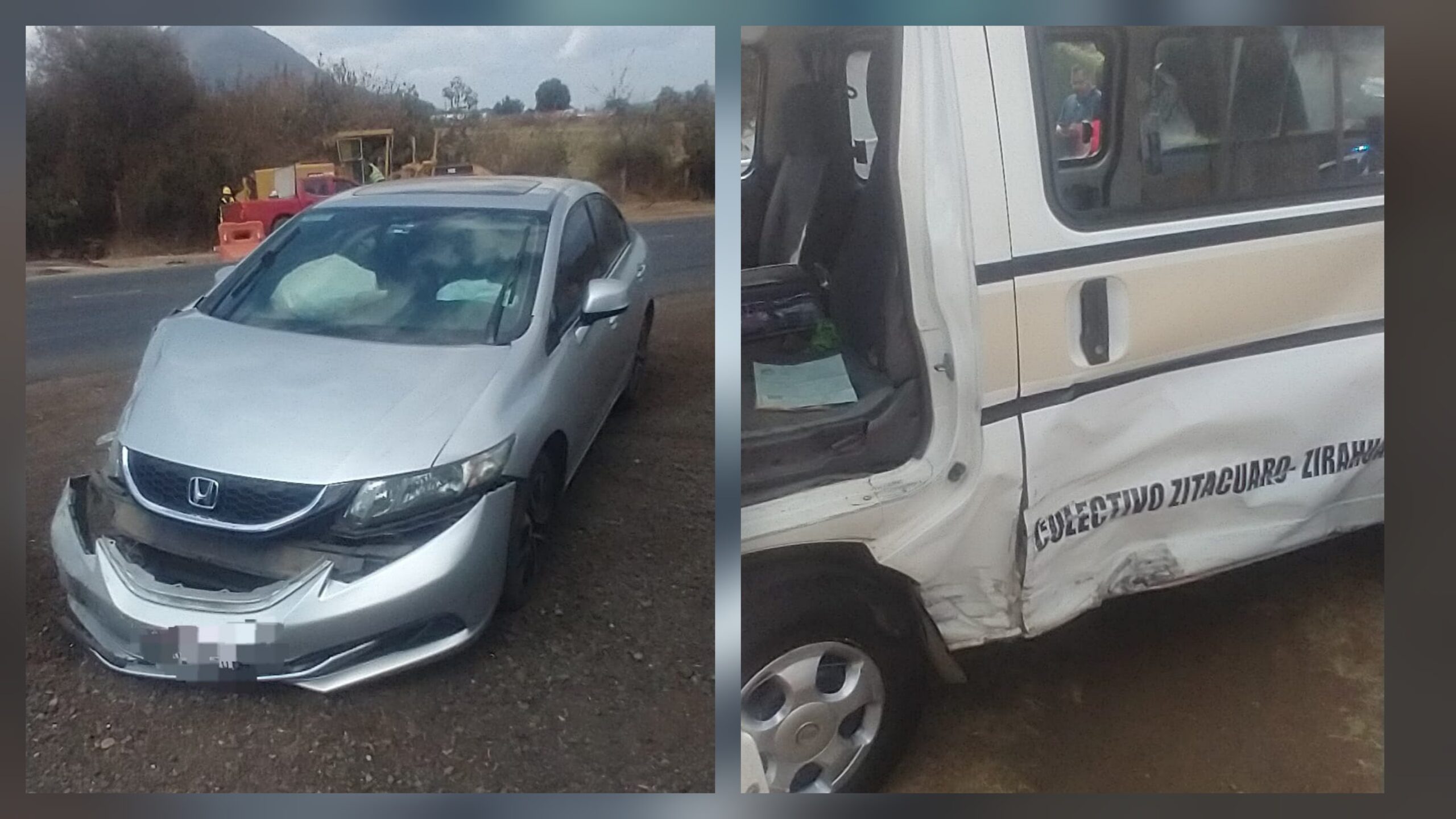 De acuerdo con el informe oficial, el incidente se registró a las 14:40 horas, involucrando a un vehículo particular y a una unidad de transporte público de la ruta Zirahuato-Zitácuaro. Al arribar al lugar, los elementos de emergencia localizaron un automóvil marca Honda, tipo Civic, color gris, y una camioneta Nissan Urban perteneciente al servicio público.