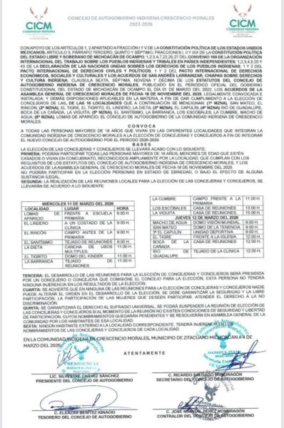 Silvestre Chávez Sánchez, presidente del consejo, enfatizó que la convocatoria surge de una asamblea general legalmente instalada y avalada por los usos y costumbres de la comunidad. “La convocatoria está sustentada en lo legal y en los usos y costumbres. Incluye a las 16 encargaturas de la comunidad indígena reconocida por el Instituto Electoral de Michoacán (IEM)”, señaló.