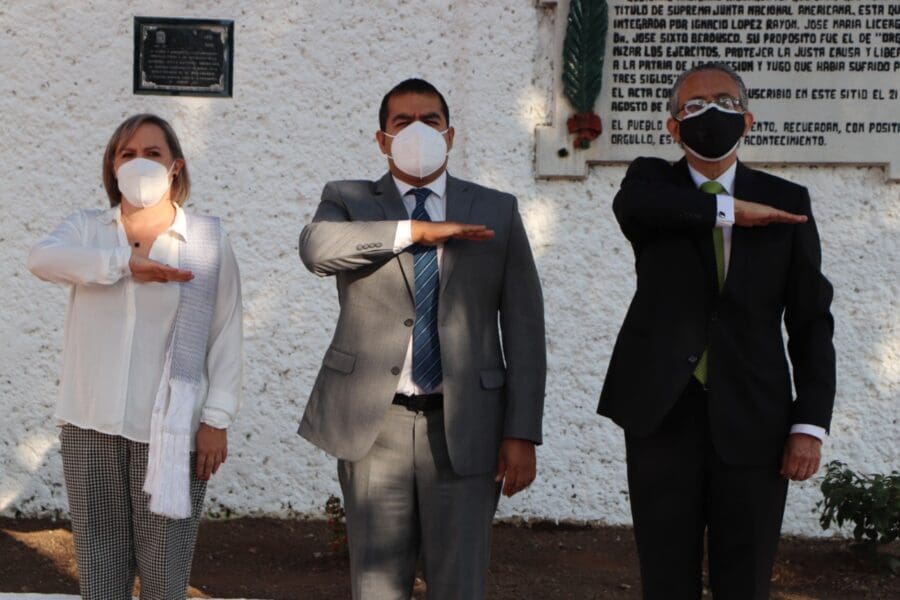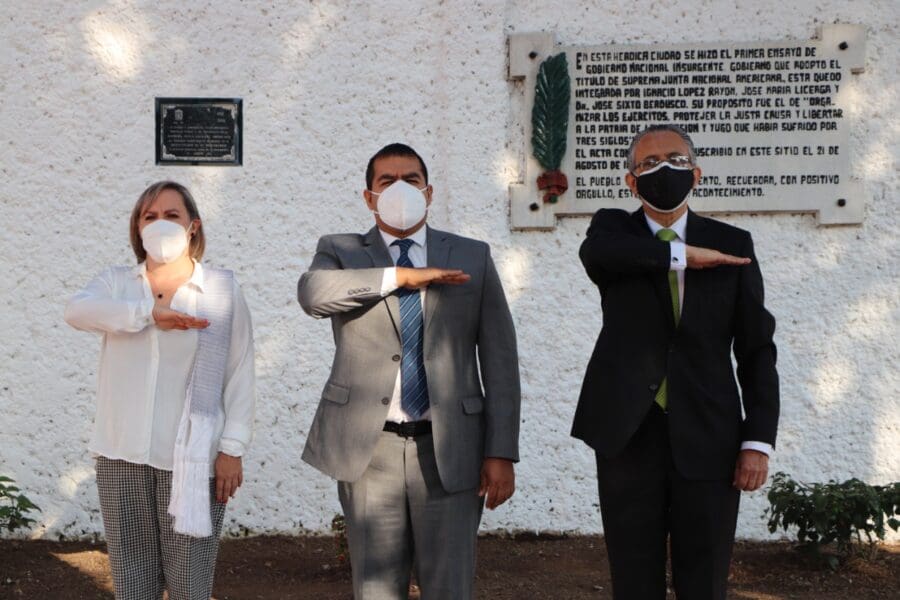 Zitácuaro, Mich., 19 de agosto del 2021.- Integrantes del Ayuntamiento 2018-2021 encabezado por el presidente Municipal, Hugo Alberto Hernández Suárez; el secretario del Ayuntamiento, Santiago Jiménez Baca y las diputadas electas, Rocío Beamonte Romero y Gloria del Carmen Tapia Reyes, presidieron el acto cívico conmemorativo del 210 aniversario de la instalación de la Suprema Junta Nacional Americana, en el monumento a dicho acontecimiento histórico.