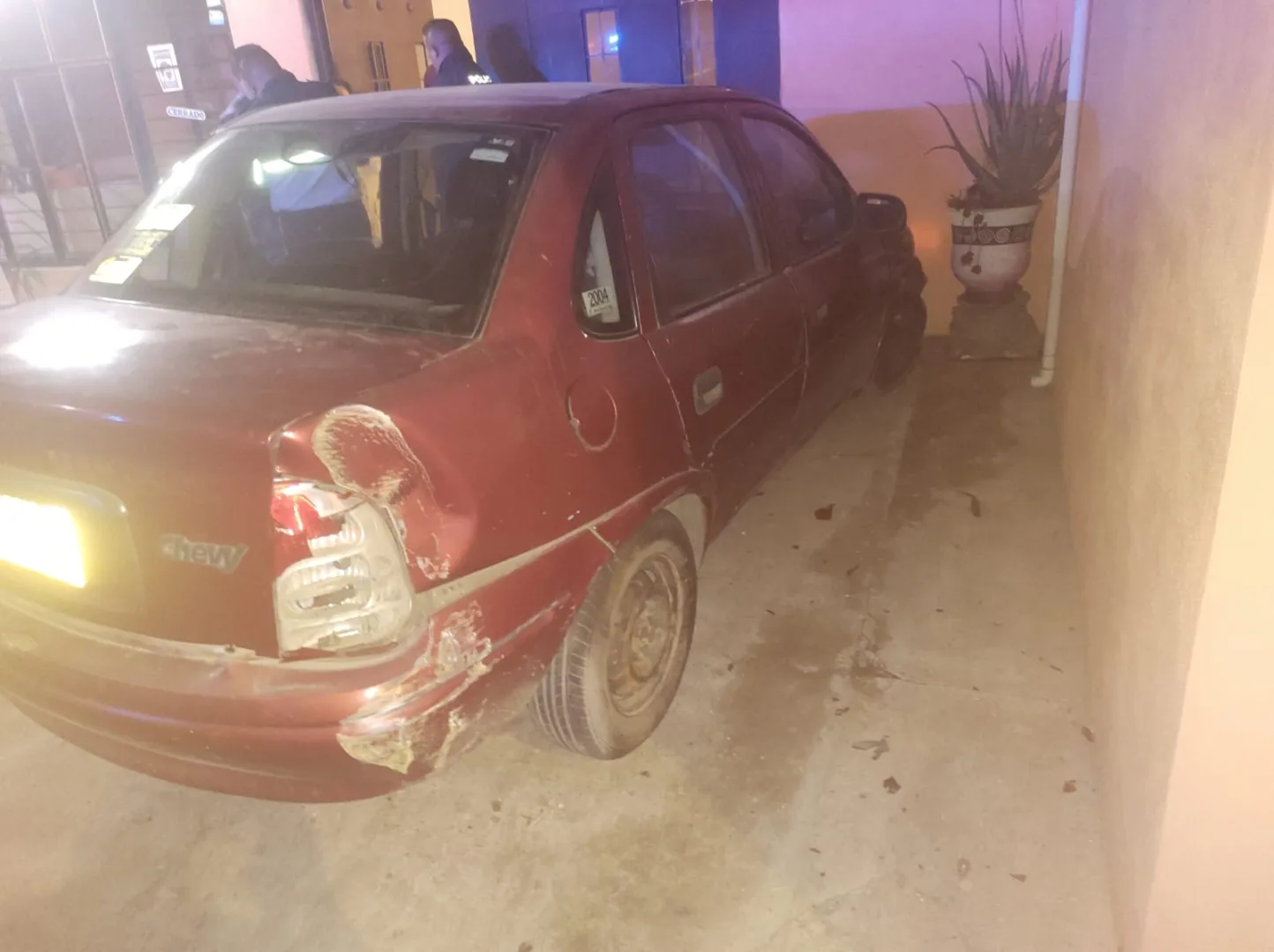 Al arribar al lugar, se contacta con la novedad estando el vehículo impactado en un portón de un domicilio particular con los siguientes datos, Chevrolet tipo Chevy color guinda, conducido por un ciudadano de 20 años de edad, con domicilio en la calle González Ortega, sin presentar ninguna lesión aparente, solo estado etílico.