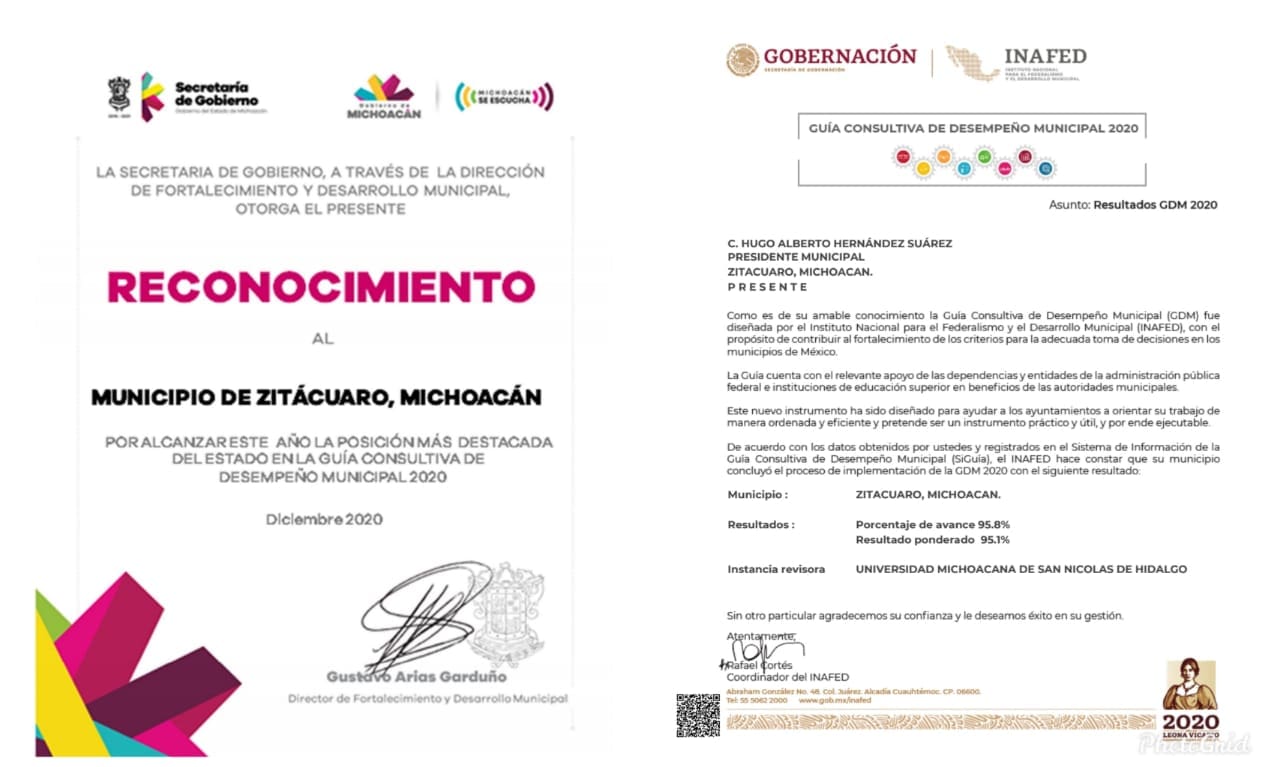 Zitácuaro, Mich., 26 de enero del 2021.- La administración municipal dirigida por el alcalde Hugo Alberto Hernández Suárez, fue supervisada y evaluada con base en la Guía Consultiva de Desempeño Municipal, tanto por la federación como por el Gobierno estatal a través de los entes reguladores de esta materia, logrando la posición más destacada en la entidad.