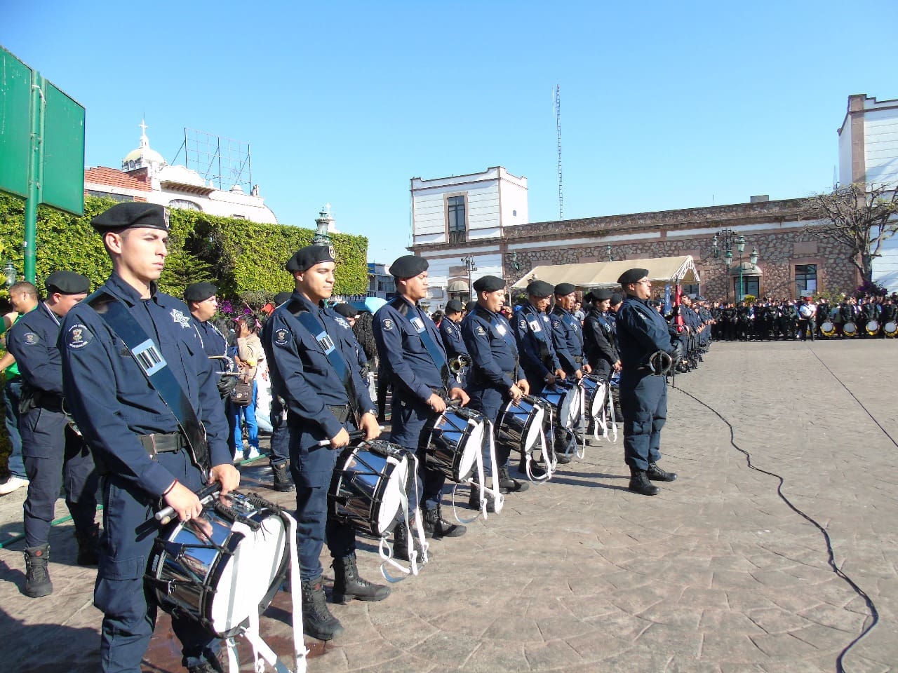 Posteriormente, los vehículos de seguridad pública, iniciaron el contingente del desfile alusivo al 5 de Febrero, seguido por la escolta y Banda de Guerra de la Secretaría de Seguridad Pública, y el contingente de las autoridades municipales, funcionarios, empleados, sindicalizados, así como de los cadetes del Instituto Estatal de Estudios Superiores en Seguridad y Profesionalización Policial IEESSPP, entre otros contingentes.