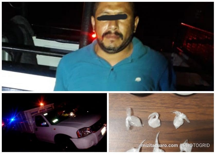 ZITÁCUARO, Michoacán.- Durante recorridos de vigilancia por la carretera federal Zitacuaro-Benito Juárez a la altura de la Encarnación, elementos de la Policía Michoacán informaron que detuvieron a José Alfredo de 36 años vecino de la calle Artillería en posesión de 9 bolsitas transparentes con sustancia granulada color blanco con las características a la droga conocida como Crystal.
