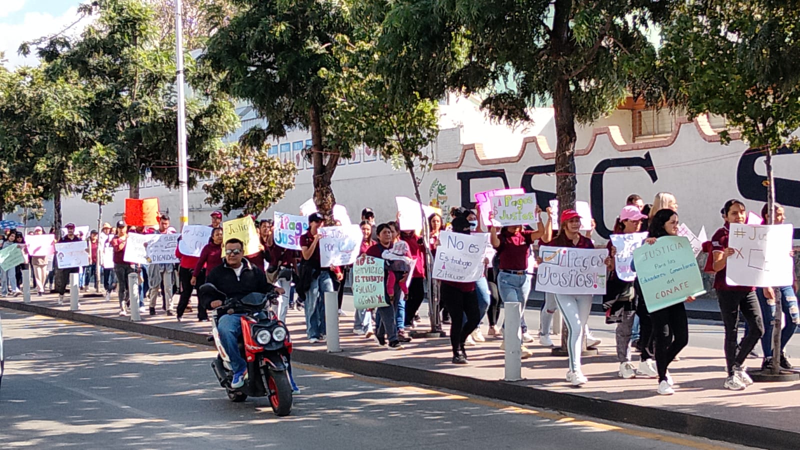 Los manifestantes partieron de las instalaciones del CONAFE y se dirigieron hacia el Palacio de Gobierno estatal, donde exigieron salarios equiparables a los de otros programas federales, acceso a prestaciones de salud y mejores condiciones laborales.