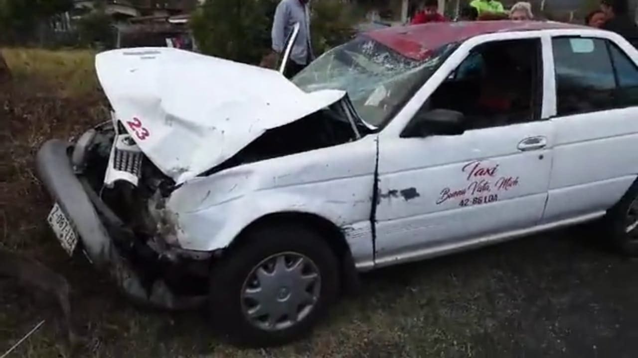 Al arribar encontraron varias personas lesionadas a causa de un choque frontal entre siguientes vehículos: Nissan Tsuru color blanco taxi de Buena Vista, con placas de circulación “X” de Michoacán, desconociendo datos del conductor, ya que no se encontraba en el lugar.