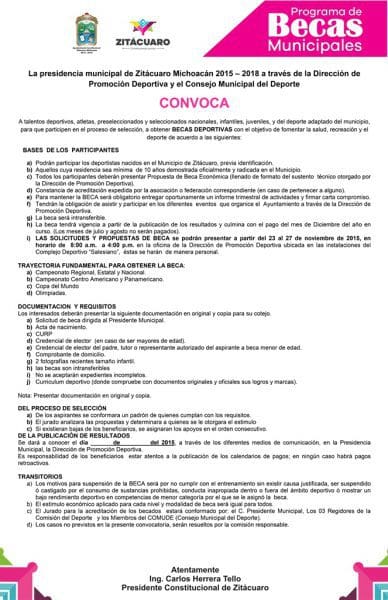 Zitácuaro, Michoacán. Con el fin de estimular a los deportistas zitacuarenses que hayan obtenido resultados destacables en el último año, el gobierno municipal que encabeza Carlos Herrera Tello, lanzó este viernes la convocatoria para el Reconocimiento Municipal del Deporte 2015 que será entregado en el marco de los festejos conmemorativos del inicio de la Revolución Mexicana.