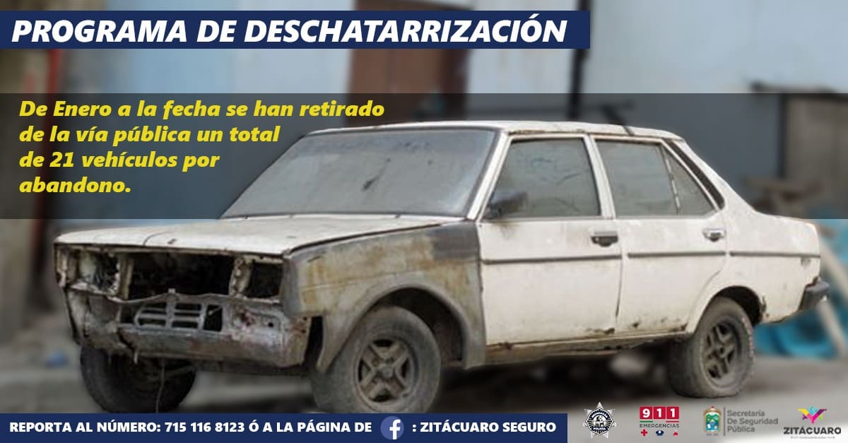 Si en tu barrio o colonia eres afectado por autos chatarra, puedes reportarlos al 715 116 8123 o a través de nuestra página de Facebook Zitácuaro Seguro, deberás proporcionar número de placas, modelo, color y marca del vehículo, así como la ubicación y/o enviar material gráfico, fotos o video.