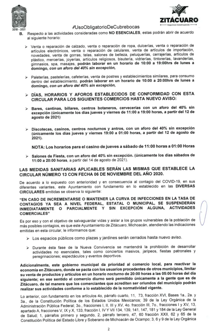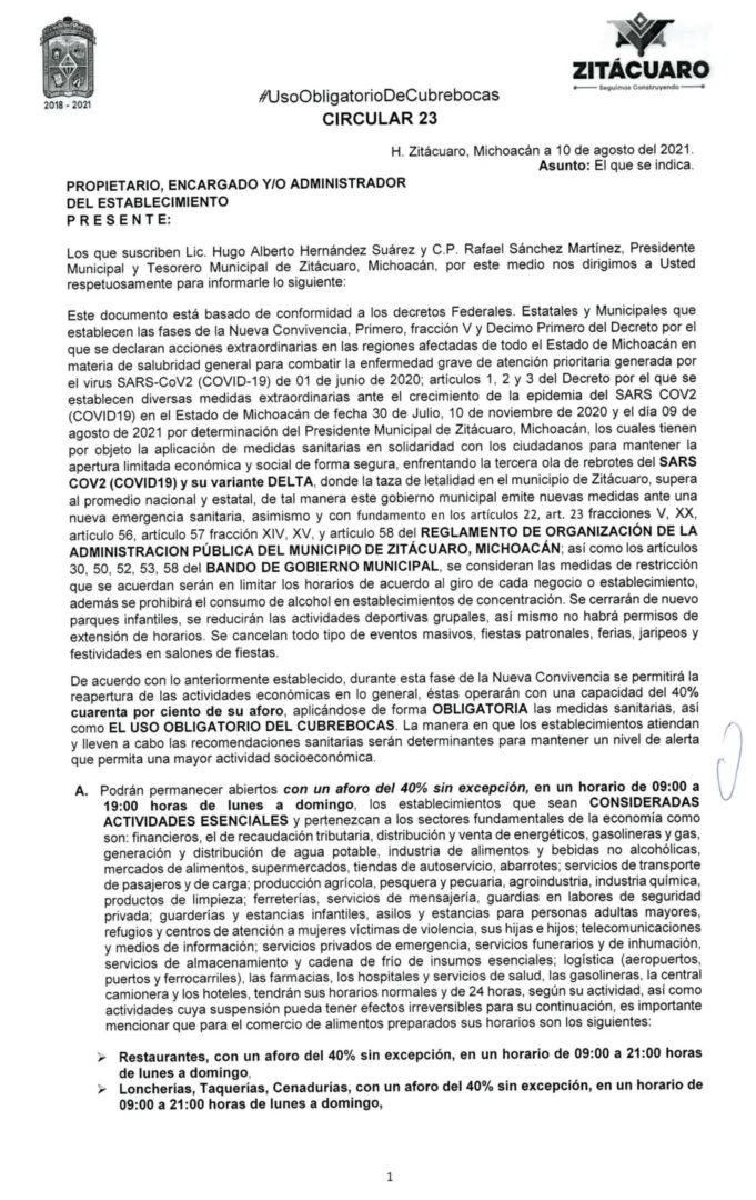 Zitácuaro, Mich., 11 de agosto del 2021.- Derivado del acelerado repunte de contagios y la creciente tasa de muertes en el municipio por COVID y su variante delta en las últimas semanas, el Gobierno municipal expidió este miércoles una nueva circular con medidas emergentes para evitar la propagación del tercer pico de la pandemia en Zitácuaro.