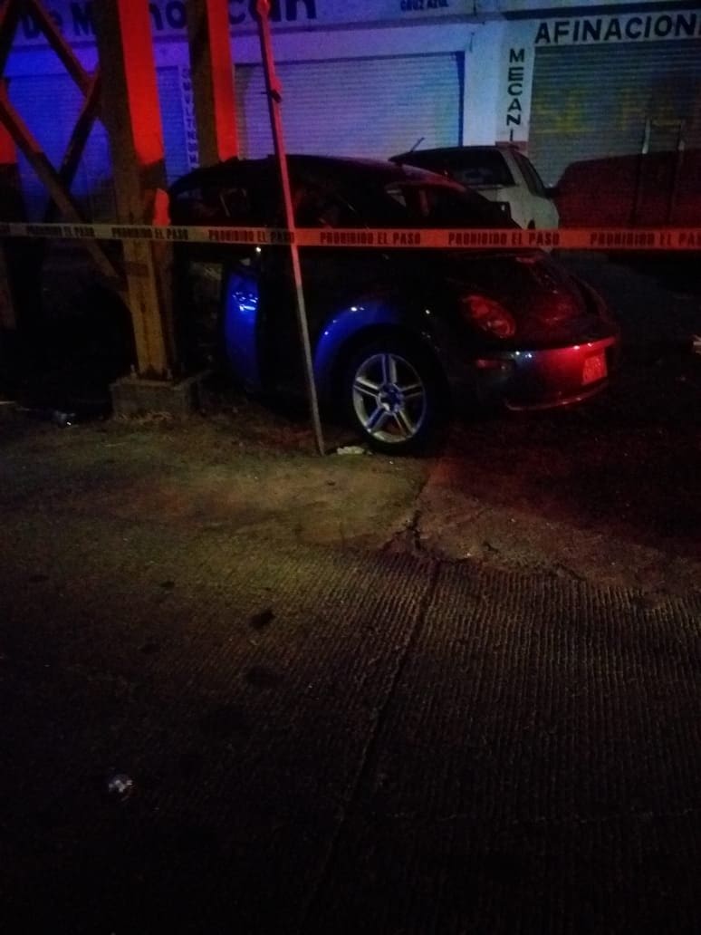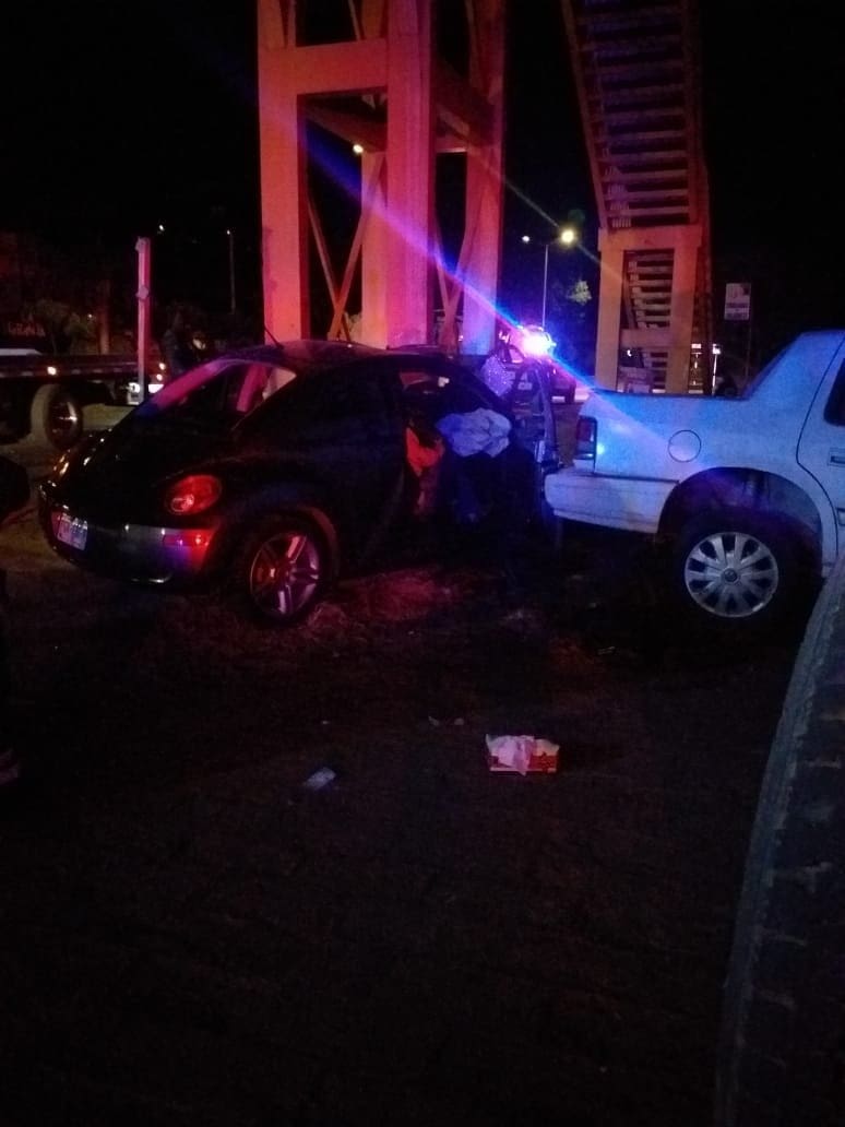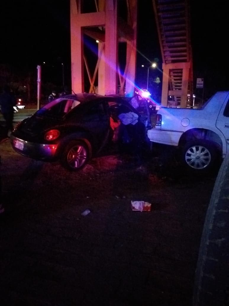 Al arribar a la ubicación se confirma la novedad, tratándose de un choque frontal contra el puente peatonal de un vehículo Volkswagen Beetle color gris, con placas de circulación de esta Entidad Federativa.