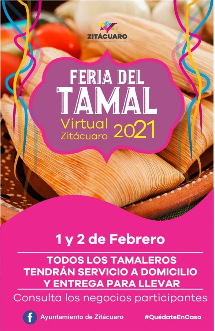 Con la finalidad de impulsar la actividad económica y acatando las medidas de salud establecidas, el Gobierno municipal de Zitácuaro, a través del Departamento de Turismo, invitan a la población a participar en la Tradicional Feria del Tamal 2021, “Edición Virtual”, a través de la cual los vendedores de este platillo típico de Zitácuaro, con motivo de la celebración del Día de la Candelaria, los días 1 y 2 de febrero, ofertarán sus productos en las modalidades de: servicio a domicilio o para llevar.