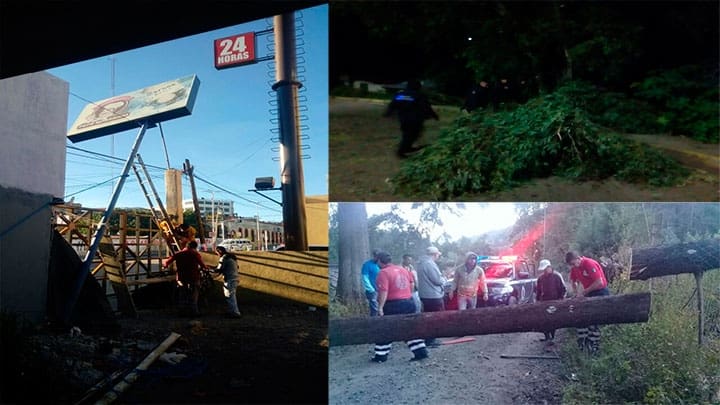 Sobre el libramiento Francisco J. Múgica un árbol cayó obstruyendo medio carril por lo que también fue retirado del lugar por Bomberos así como en apoyo a un espectacular ubicado sobre la Avenida Revolución frente a la estación de Bomberos