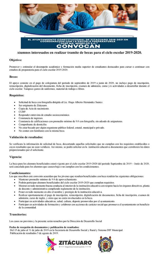 Zitácuaro, Mich.-En continuidad al compromiso realizado el Secretario de Gobierno, Carlos Herrera Tello y refrendado por el presidente municipal, Hugo Alberto Hernández Suárez, este día se presentó la convocatoria dirigida a alumnos de excelencia académica o escasos recursos económicos, de la Escuela Preparatoria “José Ma. Morelos S.C.”