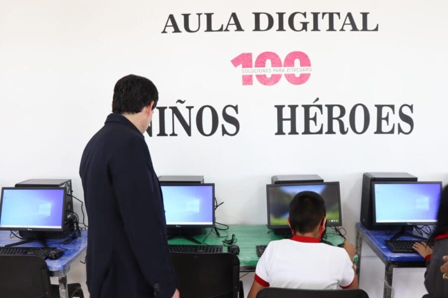 H. Zitácuaro, Mich. 03 de marzo de 2023. -Hoy inauguramos el aula digital de la escuela Niños Héroes, un total de 40 juegos de computadoras, sillas y escritorios, además de una pantalla para proyección, serán una herramienta indispensable en la formación del alumnado.