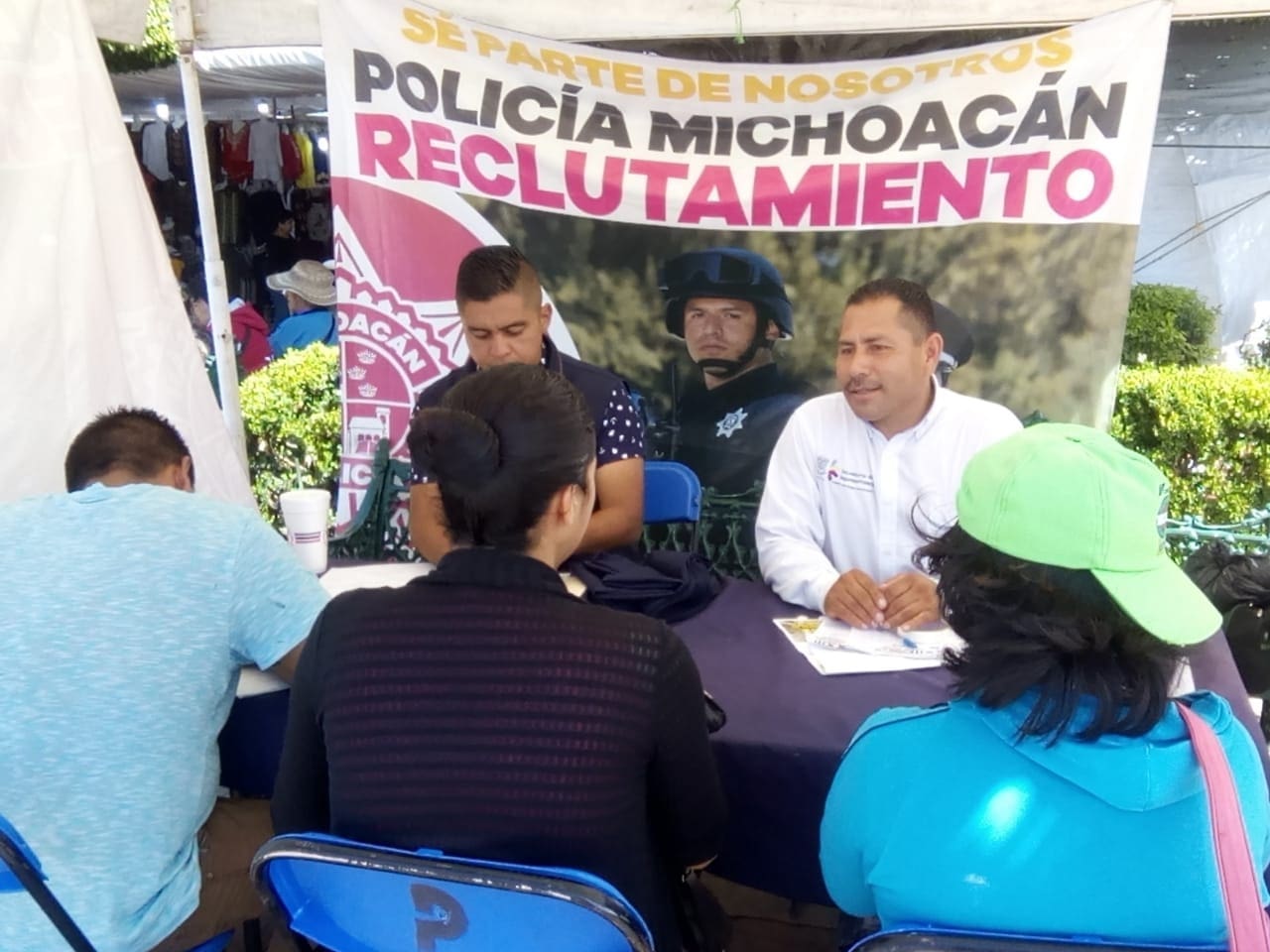 A fin de contar con elementos con vocación de servir y proteger a los michoacanos, personal de la Dirección de Desarrollo Policial, colocó un stand frente a la Presidencia Municipal, para ofrecer información y orientación a quienes aspiran a ser parte de la Policía Michoacán.