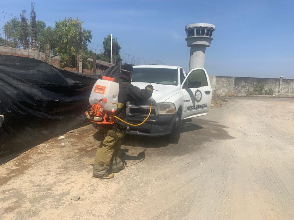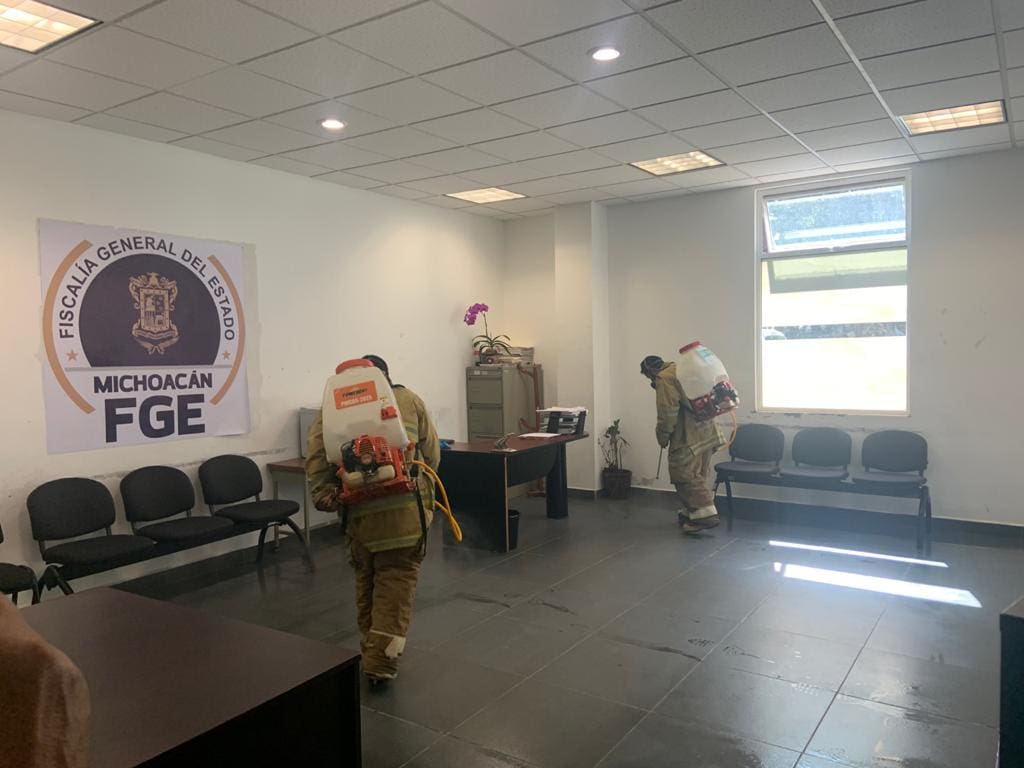 Zitácuaro,Michoacán.-La Subdirección General del Cuerpo de Bomberos informó que brindó apoyó al Personal de la Fiscalía Regional con sede en Zitácuaro,realizando la Sanitización de las instalaciones de dicha institución.
