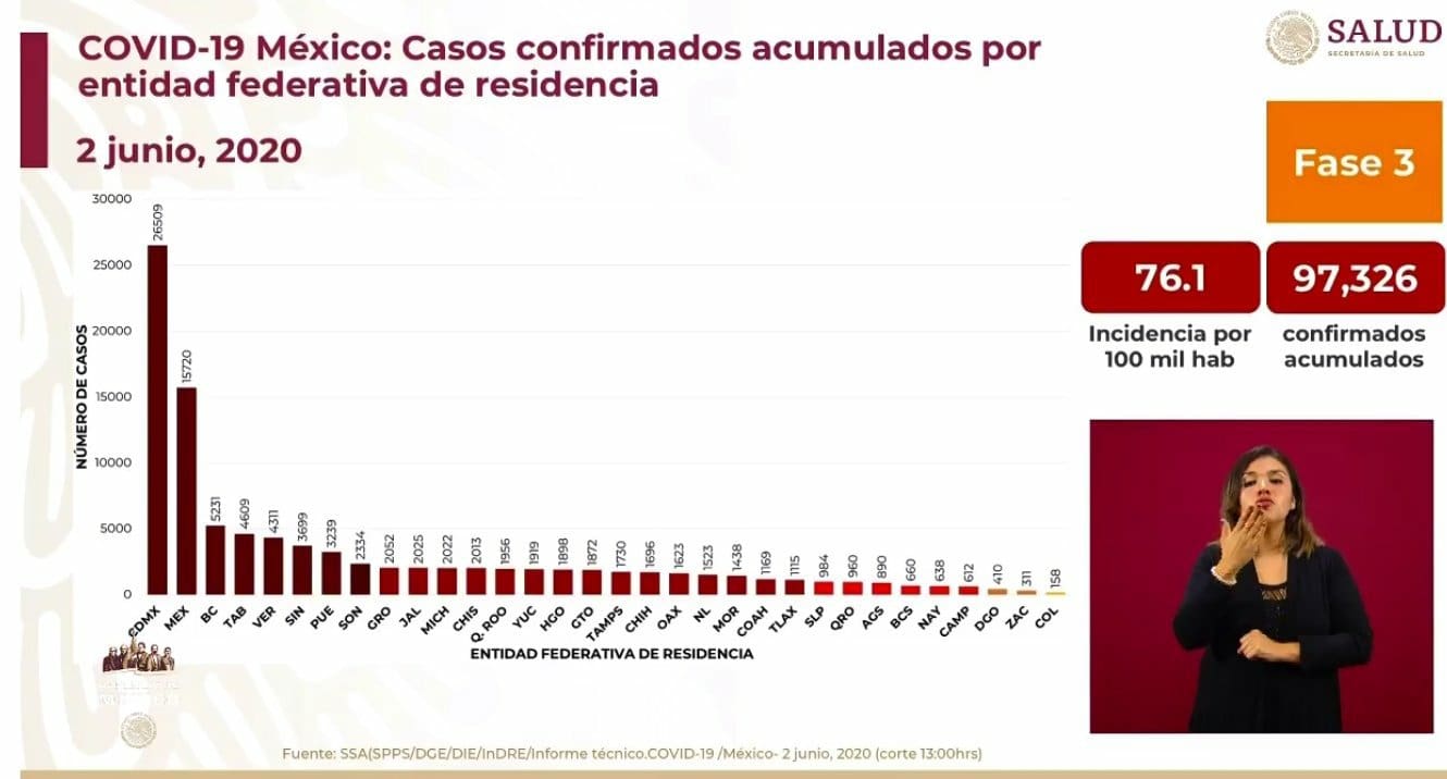 México suma 97,326 casos por COVID-19 y 10,637 muertos.