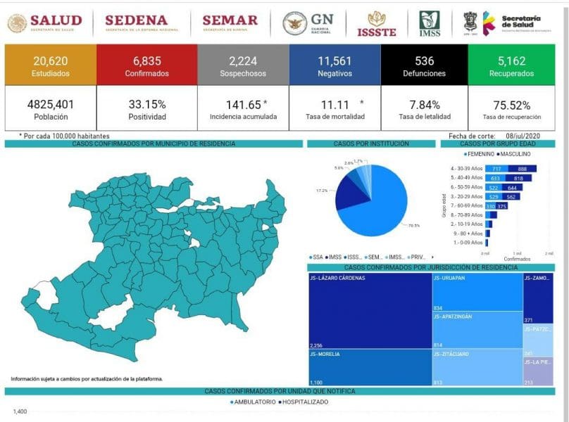 Michoacán suma 536 muertos y 6835 casos positivos por COVID-19