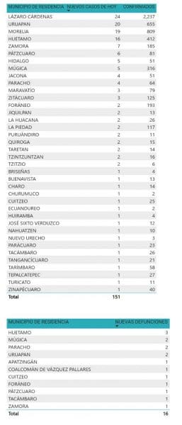 *- Michoacán registró en las últimas 24 horas 16 muertos y 151 casos nuevos por COVID-19, suman 536 defunciones y 6835 casos acumulados.