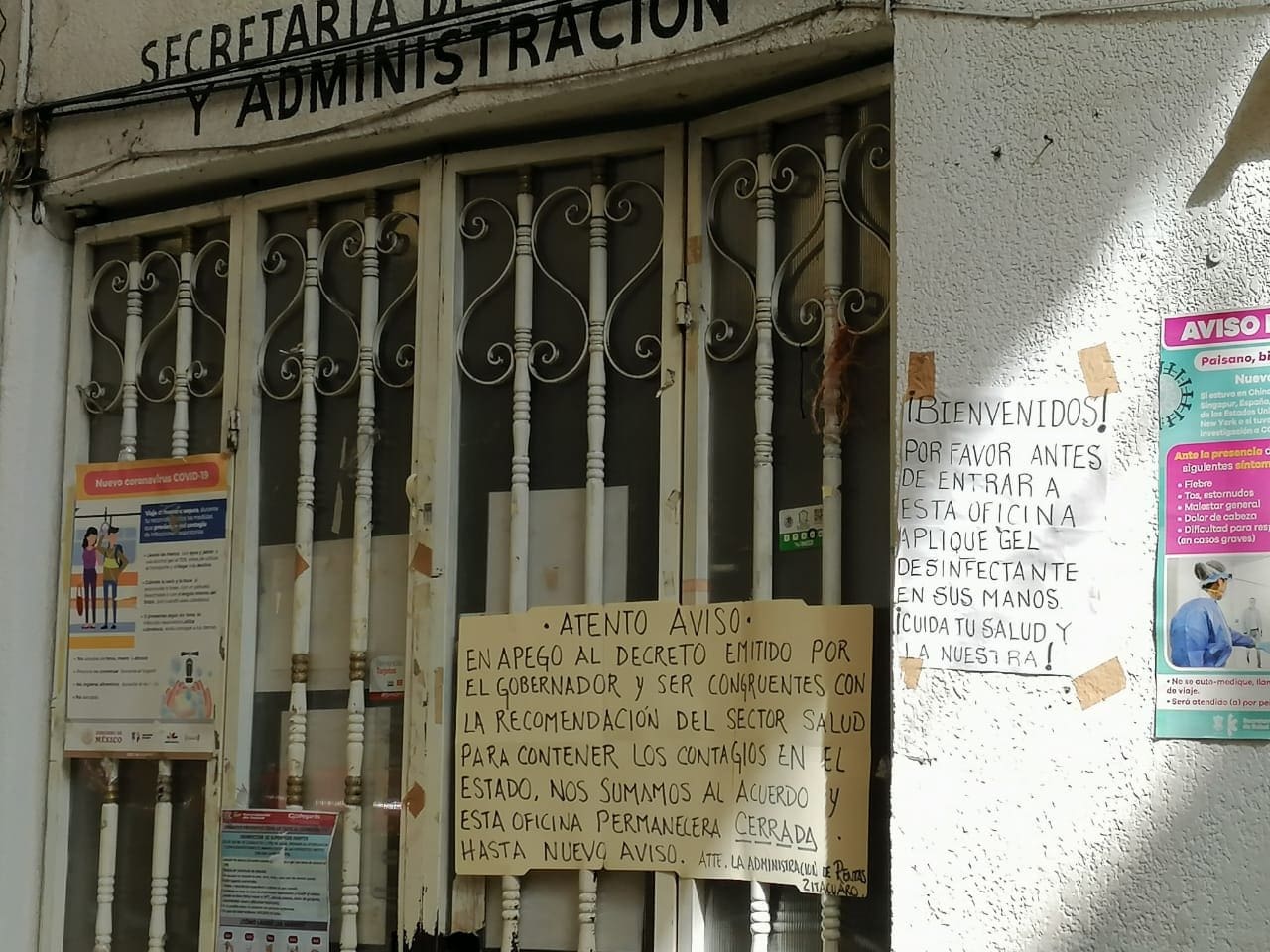 En esta oficina se ha colocado una cartulina donde se menciona que en apego al decreto emitido por el gobernador del estado y ser congruentes con las recomendaciones del sector salud para cortar la cadena de contagios, esta oficina permanecerá cerrada hasta nuevo aviso, por lo que la población puede consultar cualquier información en la página de internet de la Secretaria de Finanzas y Administración.