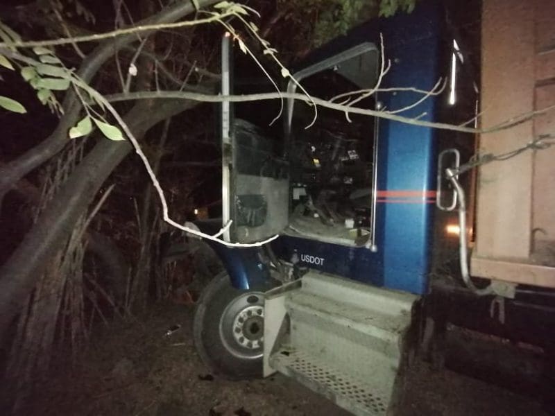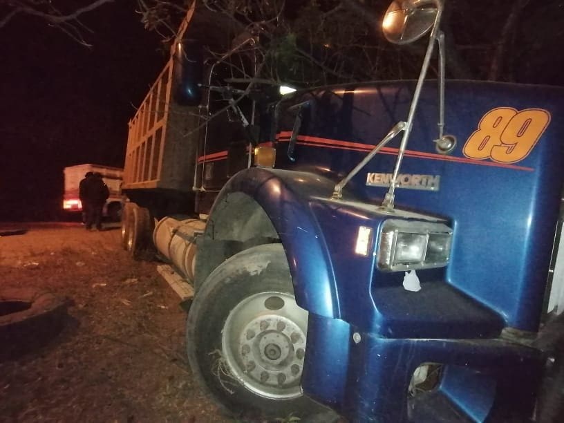 El otro vehículo involucrado es un camión tipo volteo de la marca Kenworth cabina color azul con franja color rojo y caja del mismo color, con placas de circulación del Estado de Michoacán, conducido por un ciudadano de 25 años de edad, con domicilio en calle Jacarandas.