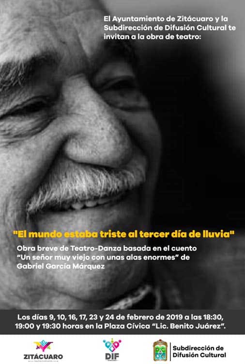 Zitácuaro, Michoacán. – El Ayuntamiento a través de la Subdirección de Difusión Cultural invitan, a la obra de teatro “El mundo estaba triste al tercer día de lluvia”. La cual es una obra breve basada en el cuento “un señor viejo con unas alas enormes” de Gabriel García Márquez.