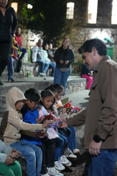 Durante su participación, el presidente municipal dio la bienvenida a los asistentes, entregó aguinaldos y palomitas, y anunció la proyección de la película Lilo y Stitch Live Action para los presentes.