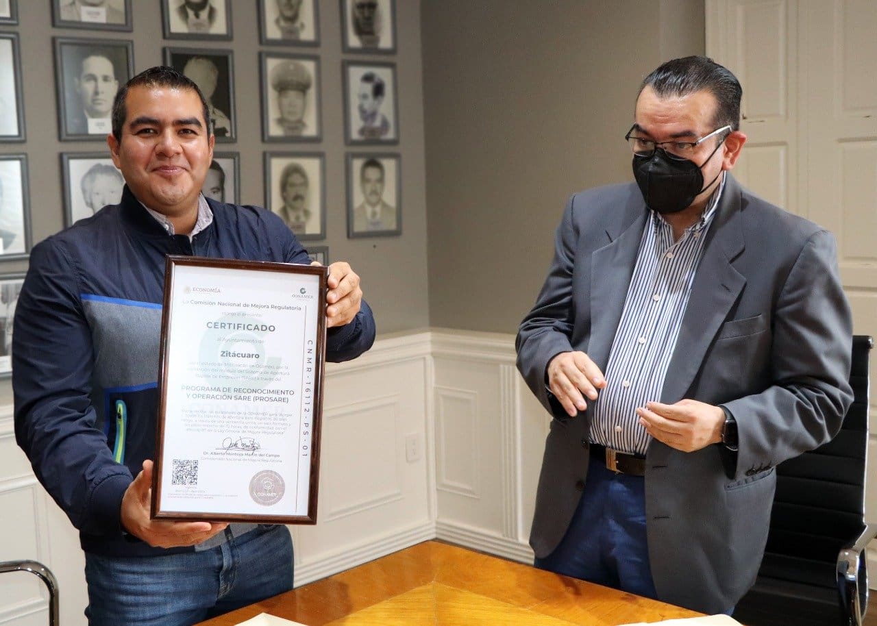 Zitácuaro, Mich., 29 de junio del 2021.- El Gobierno de Zitácuaro que encabeza el alcalde Hugo Alberto Hernández Suárez, recibió el certificado por la validación del módulo del Sistema de Apertura Rápida de Empresas, por parte de la Comisión Nacional de Mejora Regulatoria, derivado de los resultados alcanzados en simplificación de trámites para reducir la burocracia e incentivar la recaudación municipal.