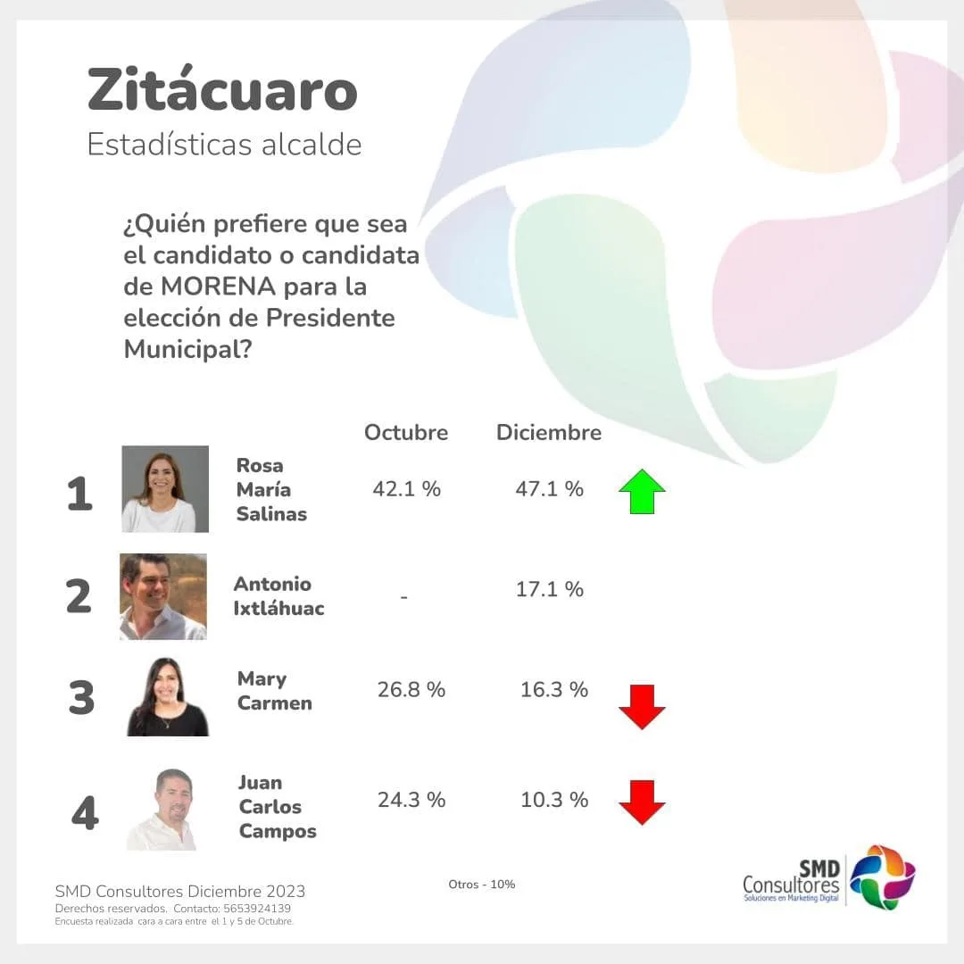 Zitácuaro, Michoacán, a 3 de enero de 2024.- De acuerdo con las encuestas realizadas en el mes de octubre y diciembre de 2023 por SDM Consultores, Rosa María Salinas se consolida como la favorita para ser candidata de Morena a la presidencia municipal de Zitácuaro, Michoacán.