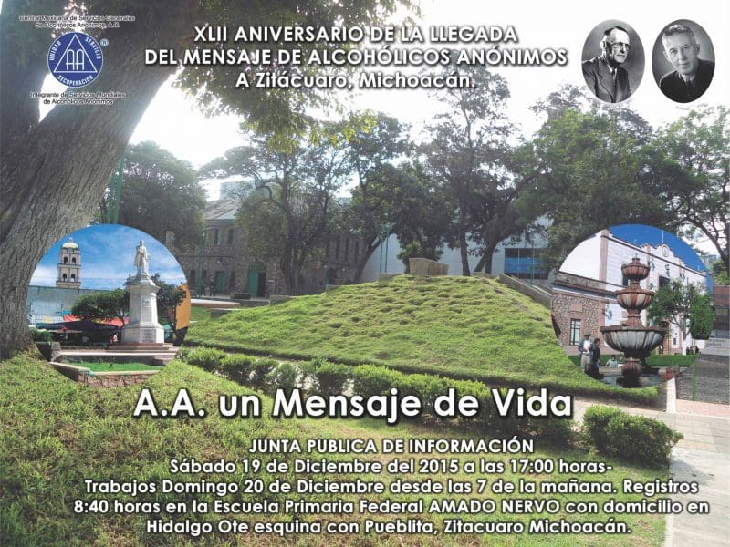 Zitácuaro, Michoacán.- Los próximos días 19 y 20 de Diciembre, Alcohólicos Anónimos celebrarán 42 años de la llegada del mensaje de AA a Zitácuaro, para hacerlo, se tiene preparada una Junta Pública de Información el primer día, a las 17 horas en la escuela primaria Amado Nervo, que se ubica en la esquina de Pueblita e Hidalgo de esta ciudad, y al día siguiente, en la misma institución tendrán trabajos inherentes a su programa de recuperación.