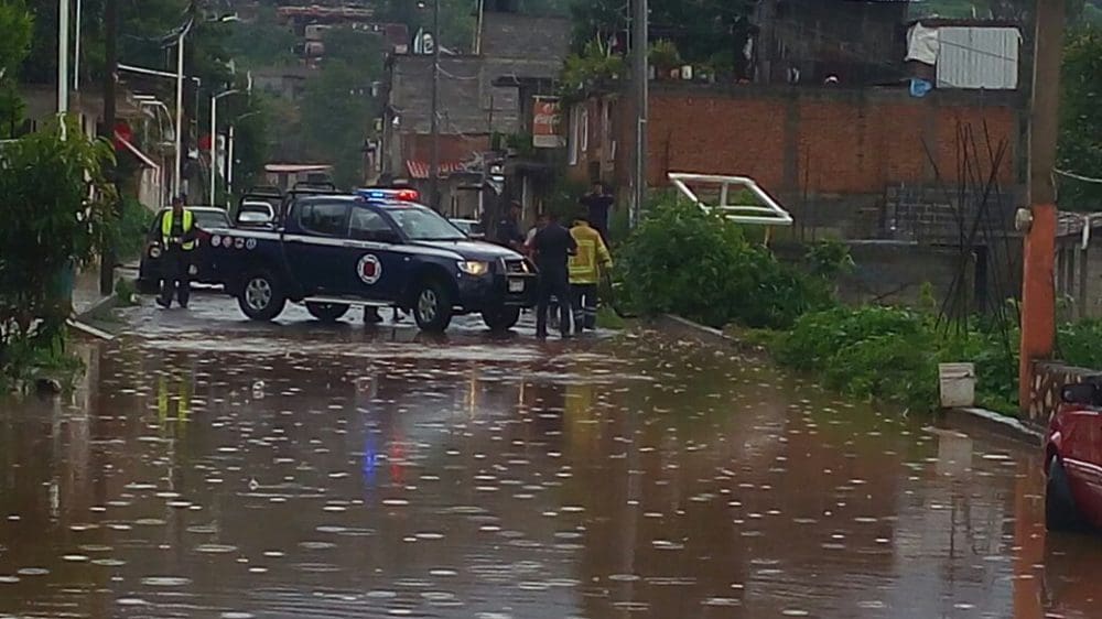Elementos de Bomberos y de la Unidad Municipal de Protección Civil, de Seguridad Pública y vecinos, retiraron escombro, lodo y basura que obstruía el libre paso de las aguas pluviales, ocasionando encharcamiento de 60 centímetros de alto en 60 metros de distancia, inundándose varias viviendas y la principal calle.