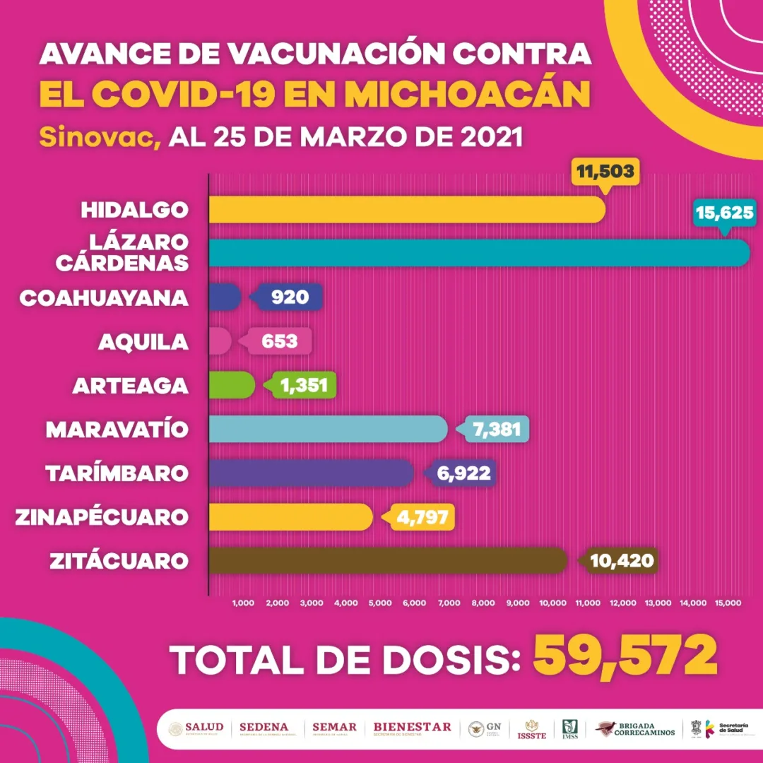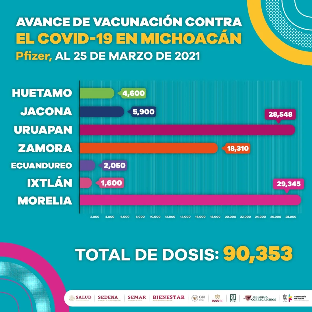 Dentro de la primera jornada de inmunización se han aplicado 184 mil 581 dosis para personas de 60 años en adelante, donde Huetamo, Jacona, Uruapan, Zamora, Ecuandureo, Ixtlán, Villamar, Aporo, Tingambato, Buenavista, Apatzingán, Parácuaro, Múgica, Angangueo, Coalcomán, Tepalcatepec, La Huacana, Aguililla, Churumuco, Nuevo Urecho, Hidalgo, Lázaro Cárdenas, Coahuayana, Aquila, Arteaga, Maravatío, Tarímbaro, Zinapécuaro y Zitácuaro ya concluyeron con esta etapa.