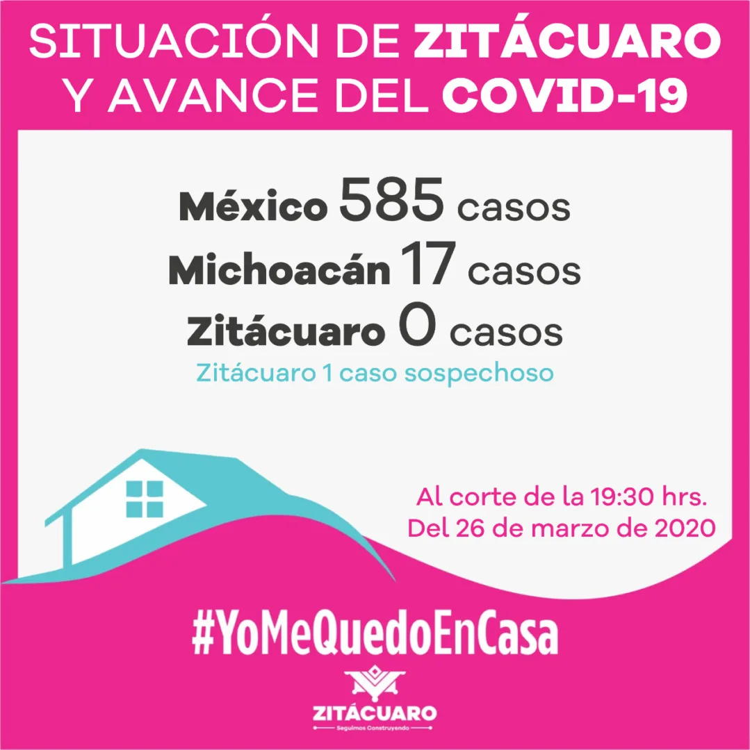 El gobierno municipal de Zitácuaro que encabeza el alcalde Hugo Alberto Hernández Suárez informa que de acuerdo a la información emitida por el Comité Estatal de Seguridad en Salud, al corte de las 19:30 hrs., del 26 de marzo de 2020, al momento se registran para COVID-19: