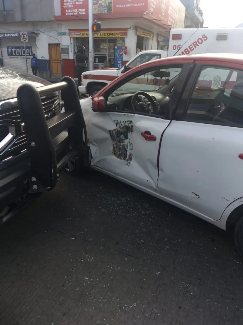 Zitácuaro, Michoacán. -Se suscita un percance vehicular entre un taxi y una patrulla de la Policía Michoacán, en Av. Revolución esquina con Degolladlo, cuando al parecer cuando la patrulla se pasó el alto provocando el accidente y resultando una persona lesionada.