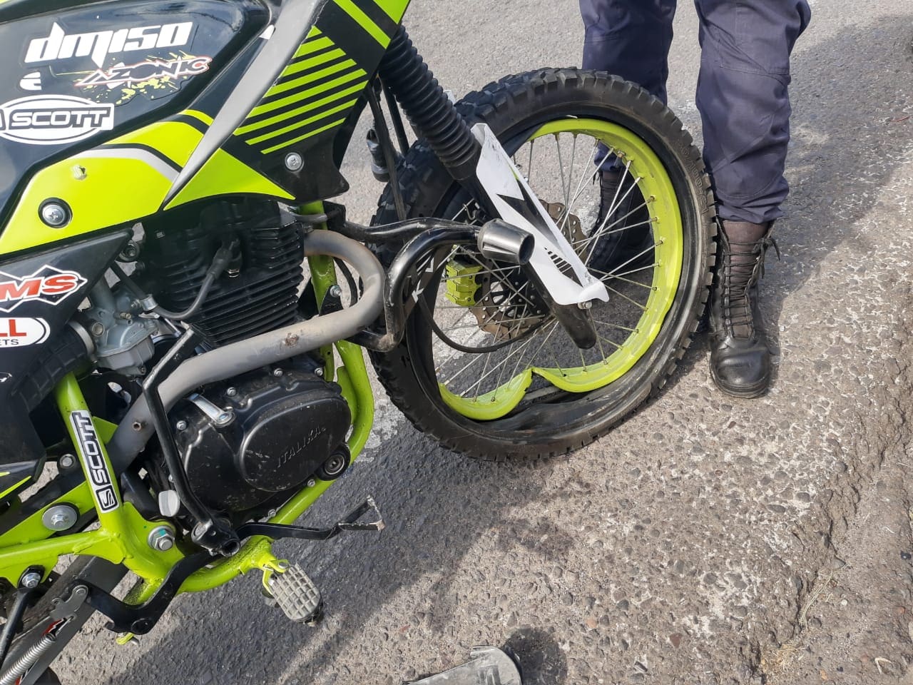 El segundo vehículo es una Motocicleta Italika 200, de color negro con verde, con placas de circulación del Estado de Michoacán, la cual era conducida por un joven de 18 años de edad, con domicilio en el Fraccionamiento la Carolina, quien a la a la valoración de los elementos presentó una herida abrasiva en falange de la mano izquierda, más crisis nerviosa sin requerir traslado a nosocomio.