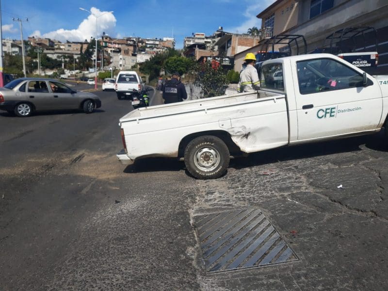 Se trata de una camioneta marca Nissan, tipo Pick Up, color blanco de la empresa CFE, con placas de circulación del Estado de Michoacán, que era conducida por un masculino de 23 años de edad, con domicilio Guadalupe Victoria Nte, quien a la valoración por los elementos de auxilio no presentó ninguna lesión aparente.