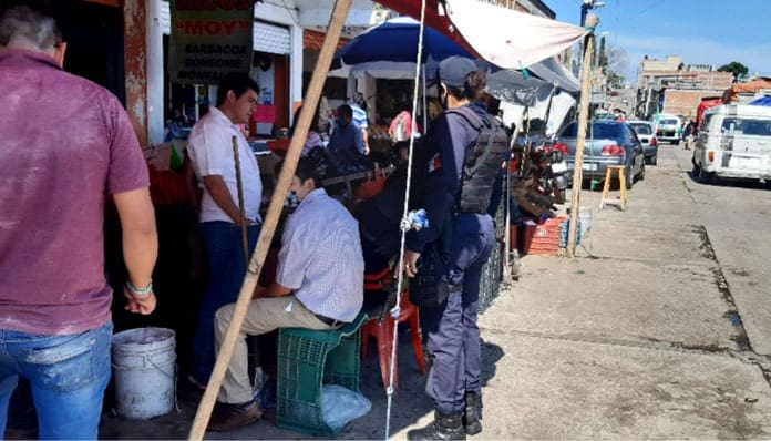 Bajo la instrucción del Comisario Toribio Sánchez Martínez, titular de la dependencia, las acciones se realizan en las principales calles que conforman el primer cuadro de la ciudad, donde existe mayor aglomeración de personas y respeten la sana distancia, así como a los comerciantes y choferes de las diferentes rutas del transporte pública para que respeten y atiendan las recomendaciones sugeridas por las autoridades sanitarias.