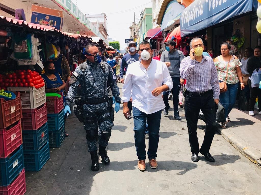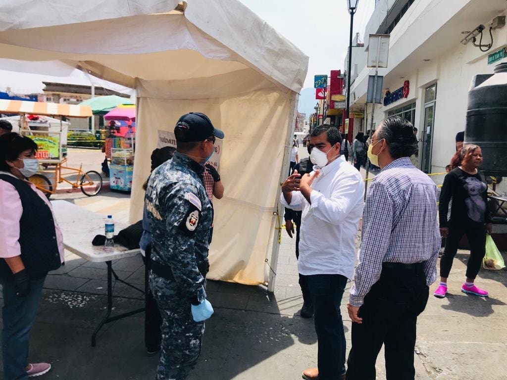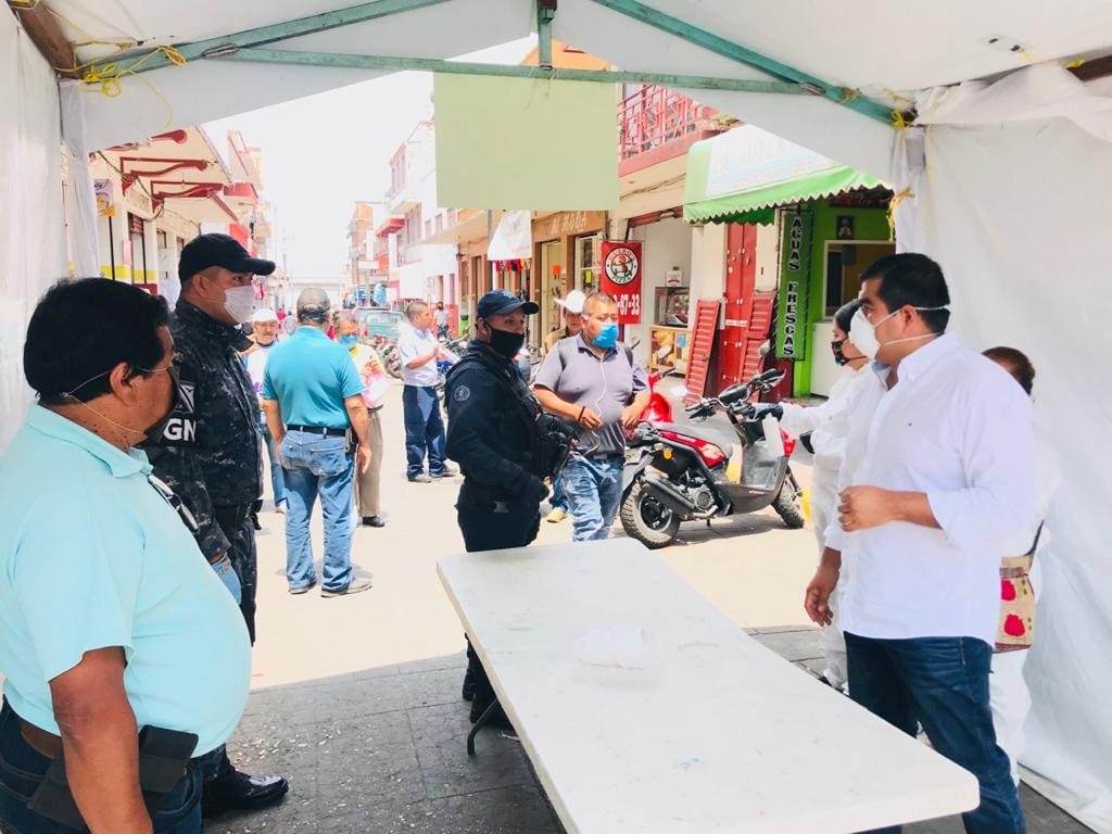 El presidente municipal Hugo Alberto Hernández Suárez, acompañado de elementos de la guardia nacional, recorrieron los filtros sanitarios instalados en el centro de la ciudad.