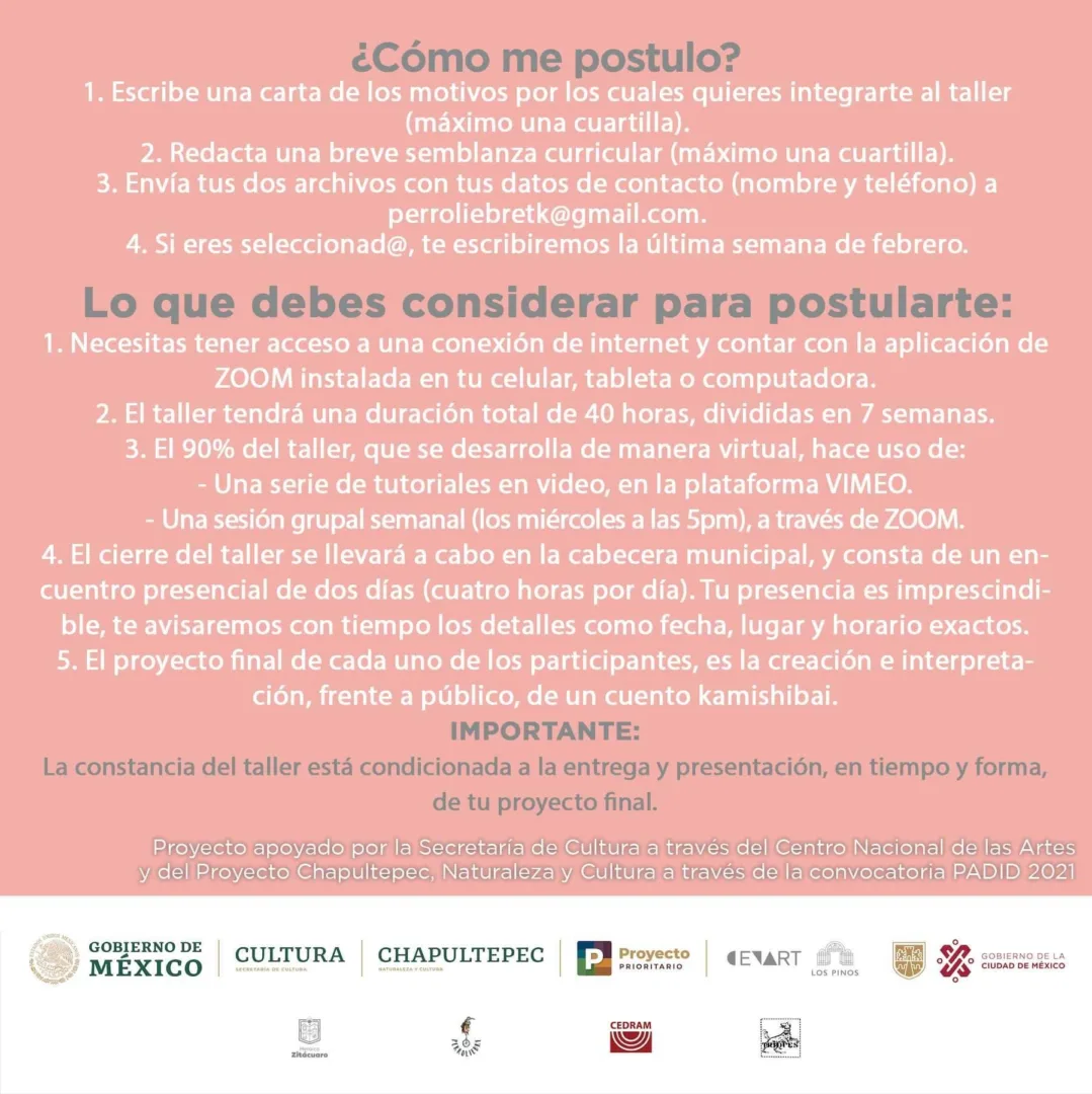 3. Envía tus documentos al correo perroliebretk@gmail.com con el asunto: Postulación para el taller en Zitácuaro.