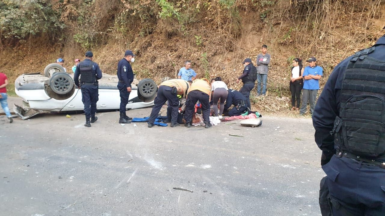 Al arribar se visualizó a un vehículo volcado sobre la cinta asfáltica y a un lado del vehículo tirados sobre la carretera las siguientes personas: una femenina de 22 años de edad, con domicilio en segunda cerrada de Begonia, a la valoración de los elementos presentaba traumatismo craneoencefálico severo, herida cortante de aproximadamente 15 centímetros en occipital a mandíbula inferior lado izquierdo y múltiples abrasiones en todo el cuerpo.