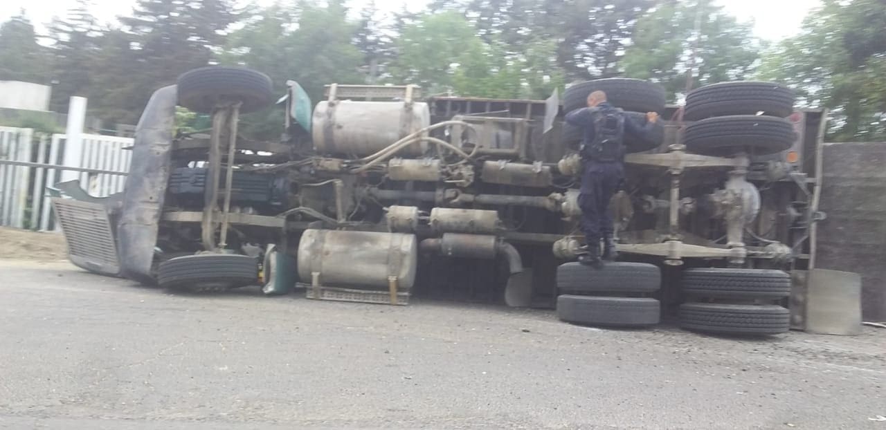Al llegar al lugar se contacta con la novedad visualizando un torton volcado sobre la cinta asfáltica con los siguientes datos: Torton tipo volteo color verde con rojo de la marca Kenwoorth, conducido por un ciudadano de 53 años de edad con domicilio en andador de Tulipanes.